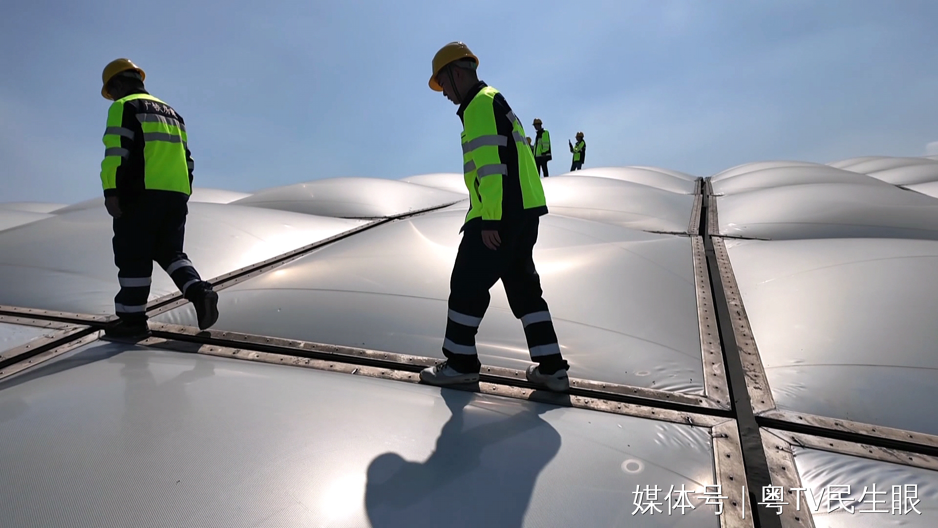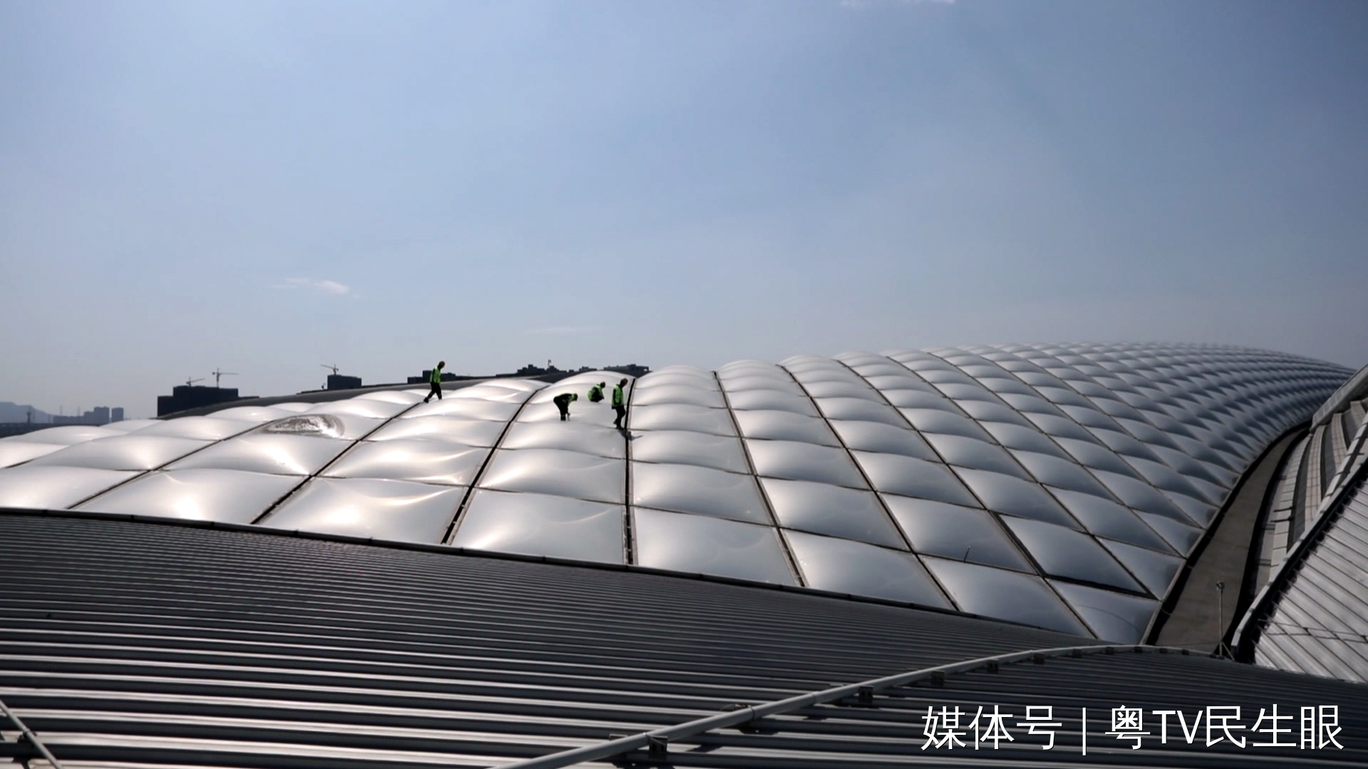 屋面上的最高点距离地面52米,最低点47米,有些地方踩下去,甚至是软的,人很容易重心不稳,黄荣彬说,2024年刚来到广州南站时,相比于害怕高空作业,更多的是好奇。他说刚上到屋面时,只感受到一个字——美!充气膜在阳光的照射下,感觉就像一朵棉花一样。