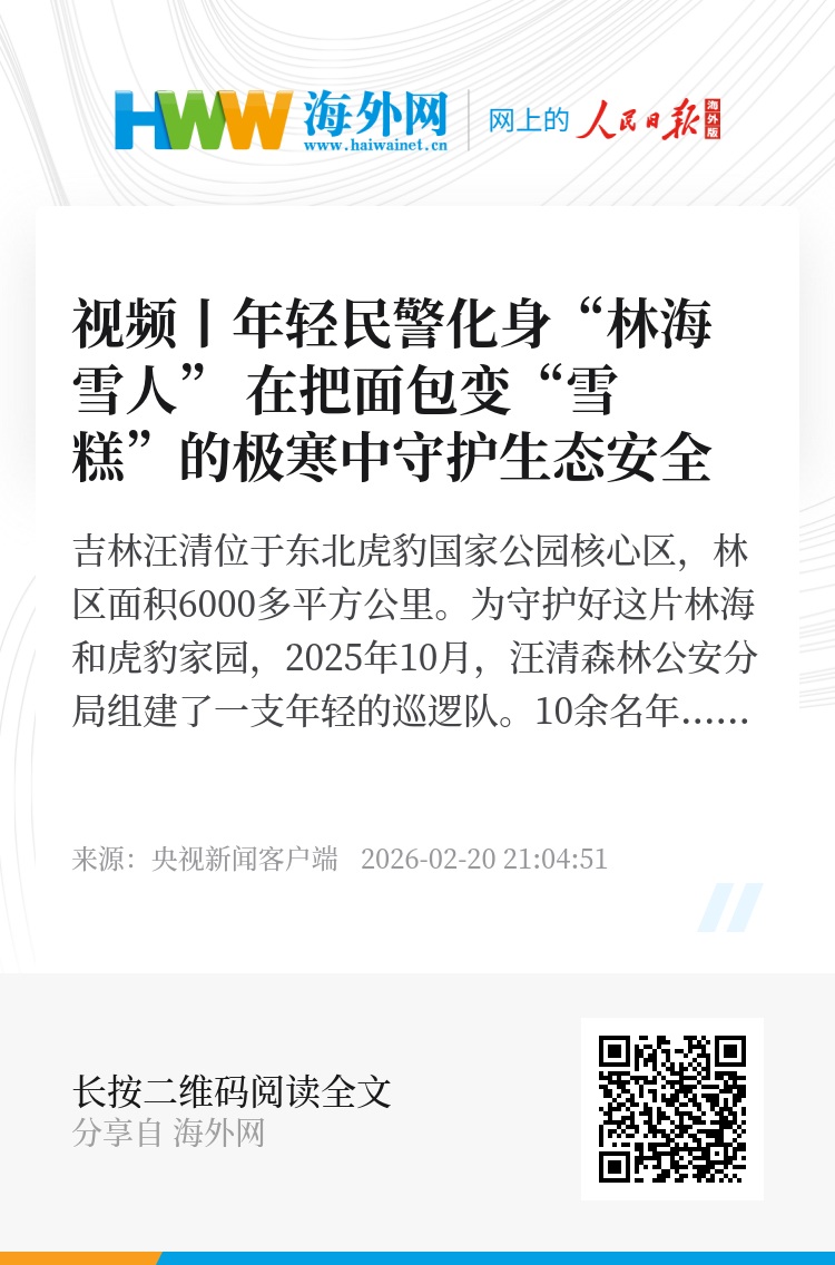 吉林汪清位于东北虎豹国家公园核心区,林区面积6000多平方公里。为守护好这片林海和虎豹家园,2025年10月,汪清森林公安分局组建了一支年轻的巡逻队。10余名年轻民警身穿白色的隐蔽服,化身“林海雪人”,穿梭在冬季的茫茫林海雪原,打击盗伐盗猎,守护生态安全。
