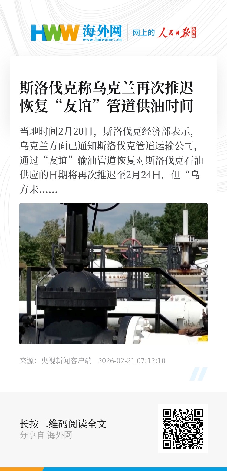 当地时间2月20日,斯洛伐克经济部表示,乌克兰方面已通知斯洛伐克管道运输公司,通过“友谊”输油管道恢复对斯洛伐克石油供应的日期将再次推迟至2月24日,但“乌方未就此次推迟给出任何解释”。