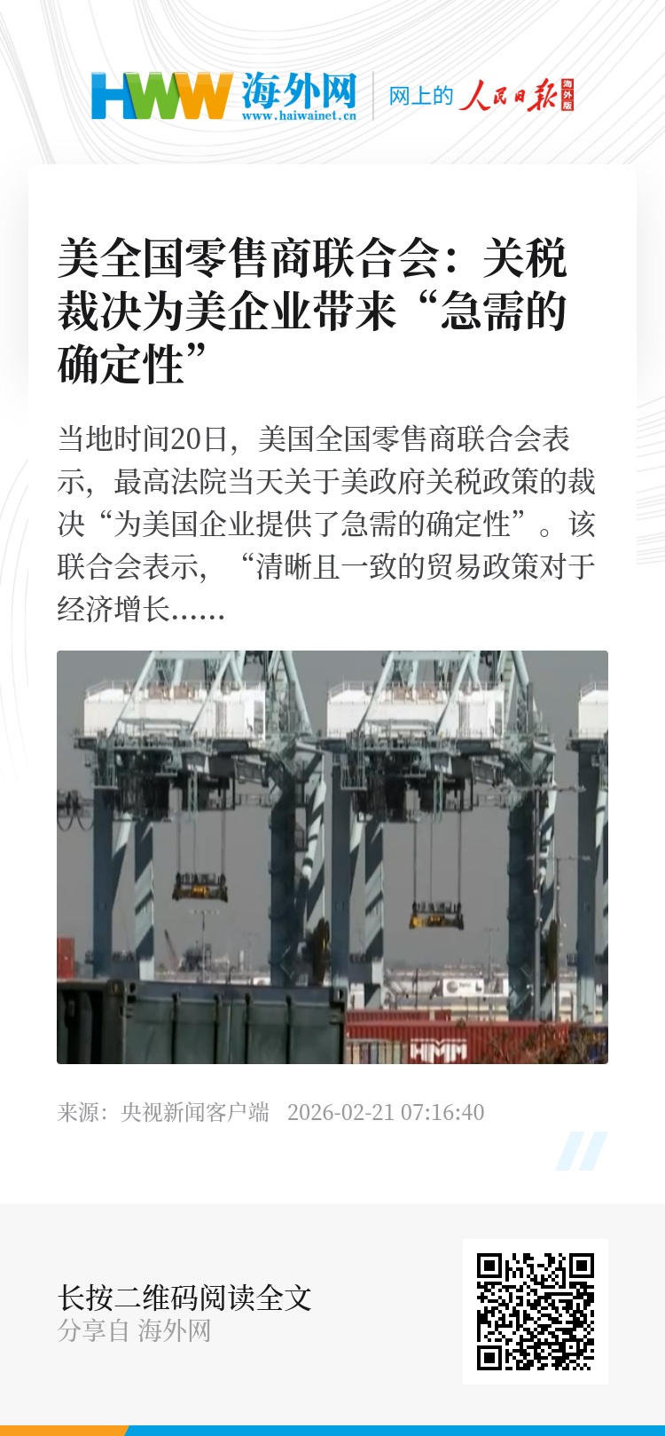 当地时间20日,美国全国零售商联合会表示,最高法院当天关于美政府关税政策的裁决“为美国企业提供了急需的确定性”。