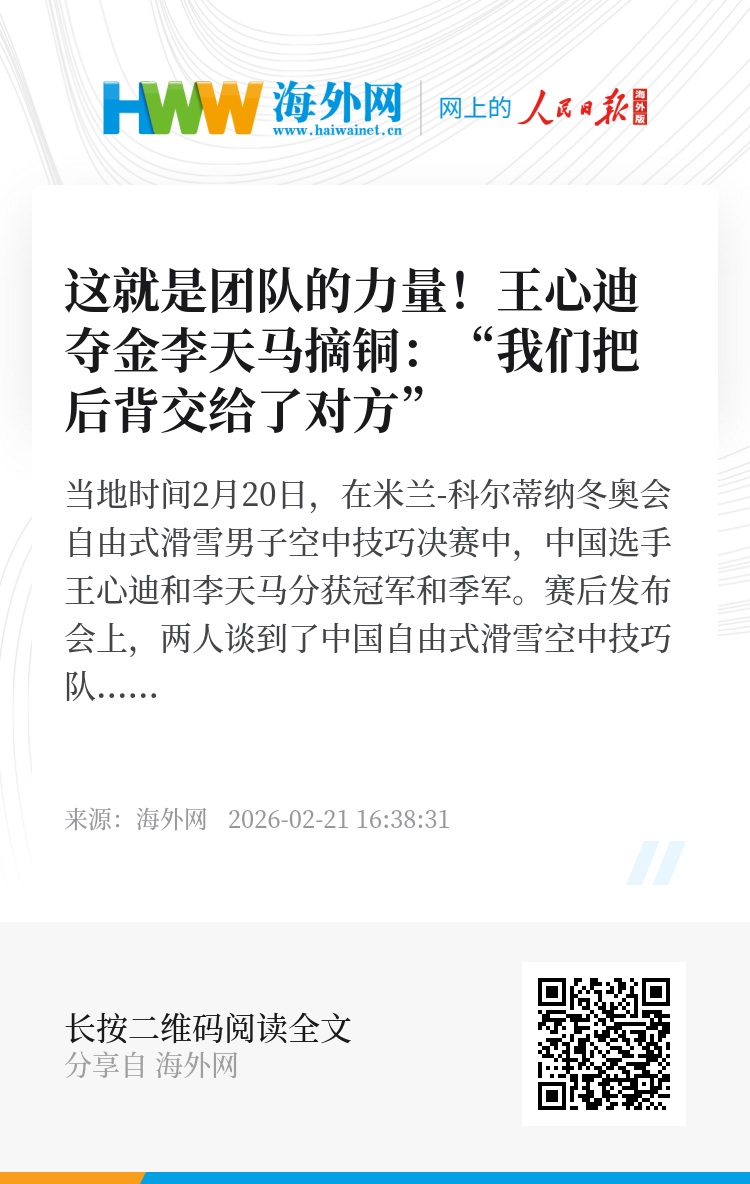 当地时间2月20日,在米兰-科尔蒂纳冬奥会自由式滑雪男子空中技巧决赛中,中国选手王心迪和李天马分获冠军和季军。赛后发布会上,两人谈到了中国自由式滑雪空中技巧队之间的感情。(记者 刘峣)