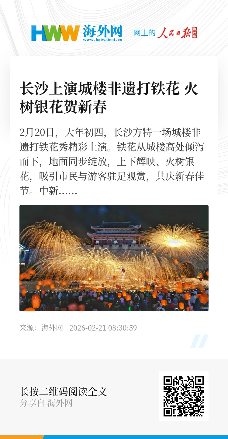 2月20日,大年初四,长沙方特一场城楼非遗打铁花秀精彩上演。铁花从城楼高处倾泻而下,地面同步绽放,上下辉映、火树银花,吸引市民与游客驻足观赏,共庆新春佳节。中新社记者 杨华峰 摄/图源:视觉中国