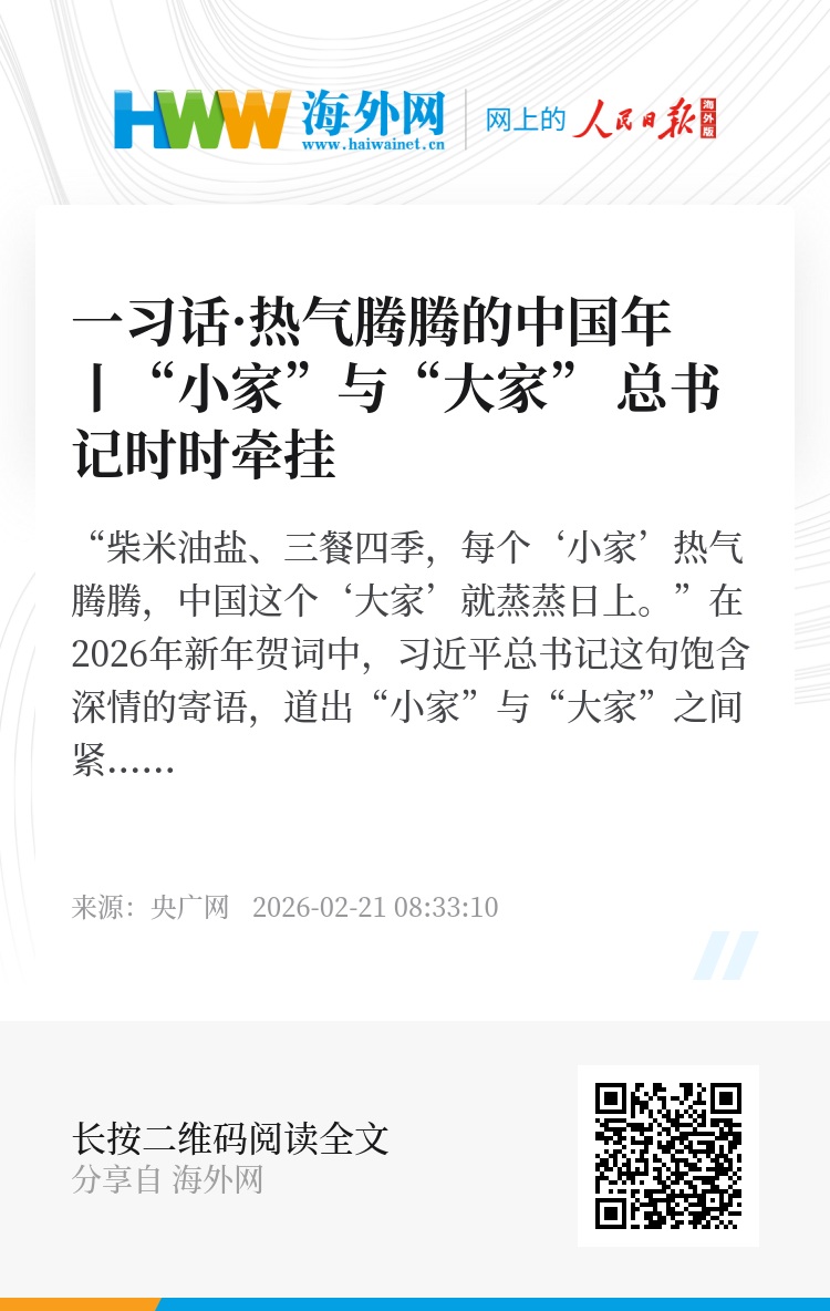 在2026年新年贺词中,习近平总书记这句饱含深情的寄语,道出“小家”与“大家”之间紧密而深刻的联系。“小家”活力温馨,映照出“大家”蓬勃发展的万千气象。“大家”强盛壮阔,守护着无数“小家”幸福祥和。