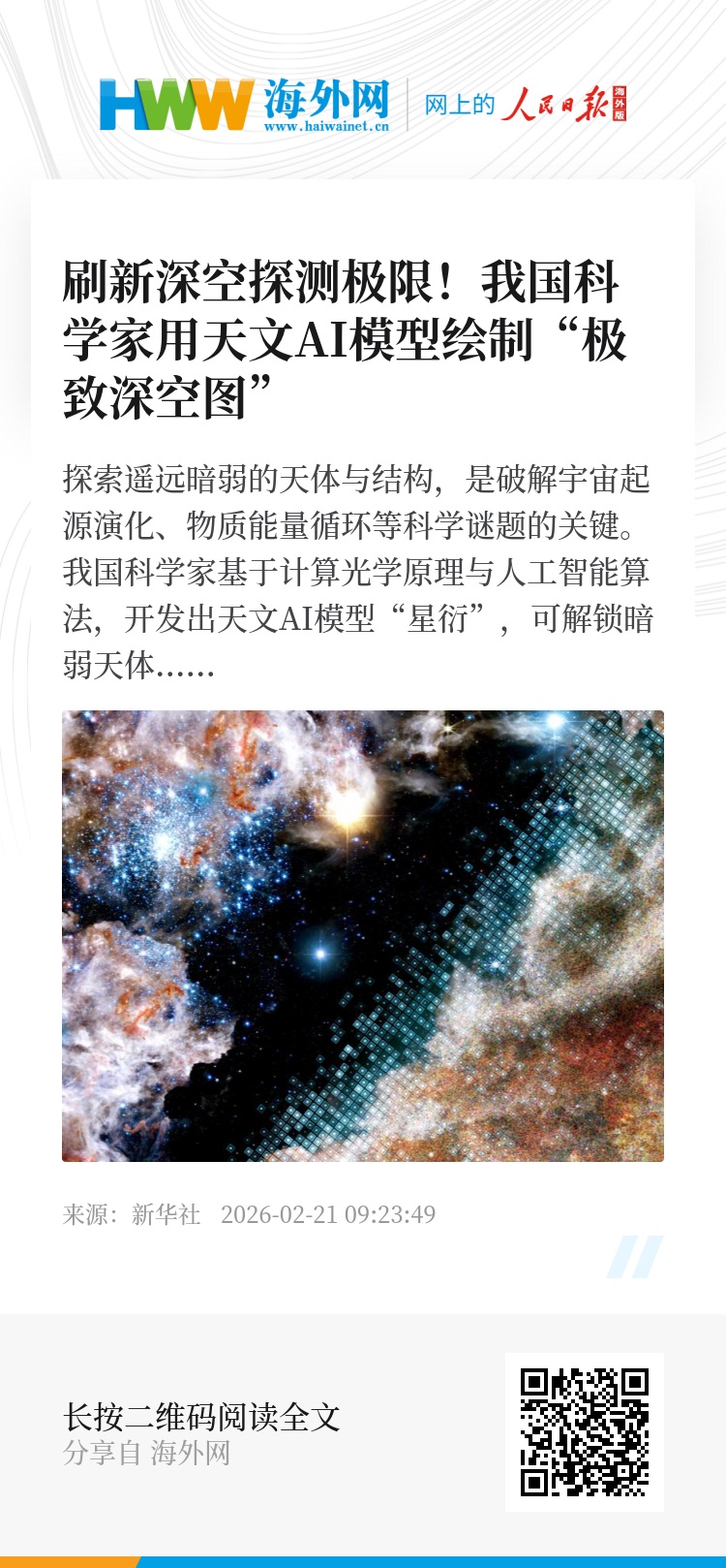 探索遥远暗弱的天体与结构,是破解宇宙起源演化、物质能量循环等科学谜题的关键。我国科学家基于计算光学原理与人工智能算法,开发出天文AI模型“星衍”,可解锁暗弱天体信号,探测到超过130亿光年的星系,并获取目前国际已知探测最深的深空影像。该成果2月20日凌晨在线发表于《科学》。