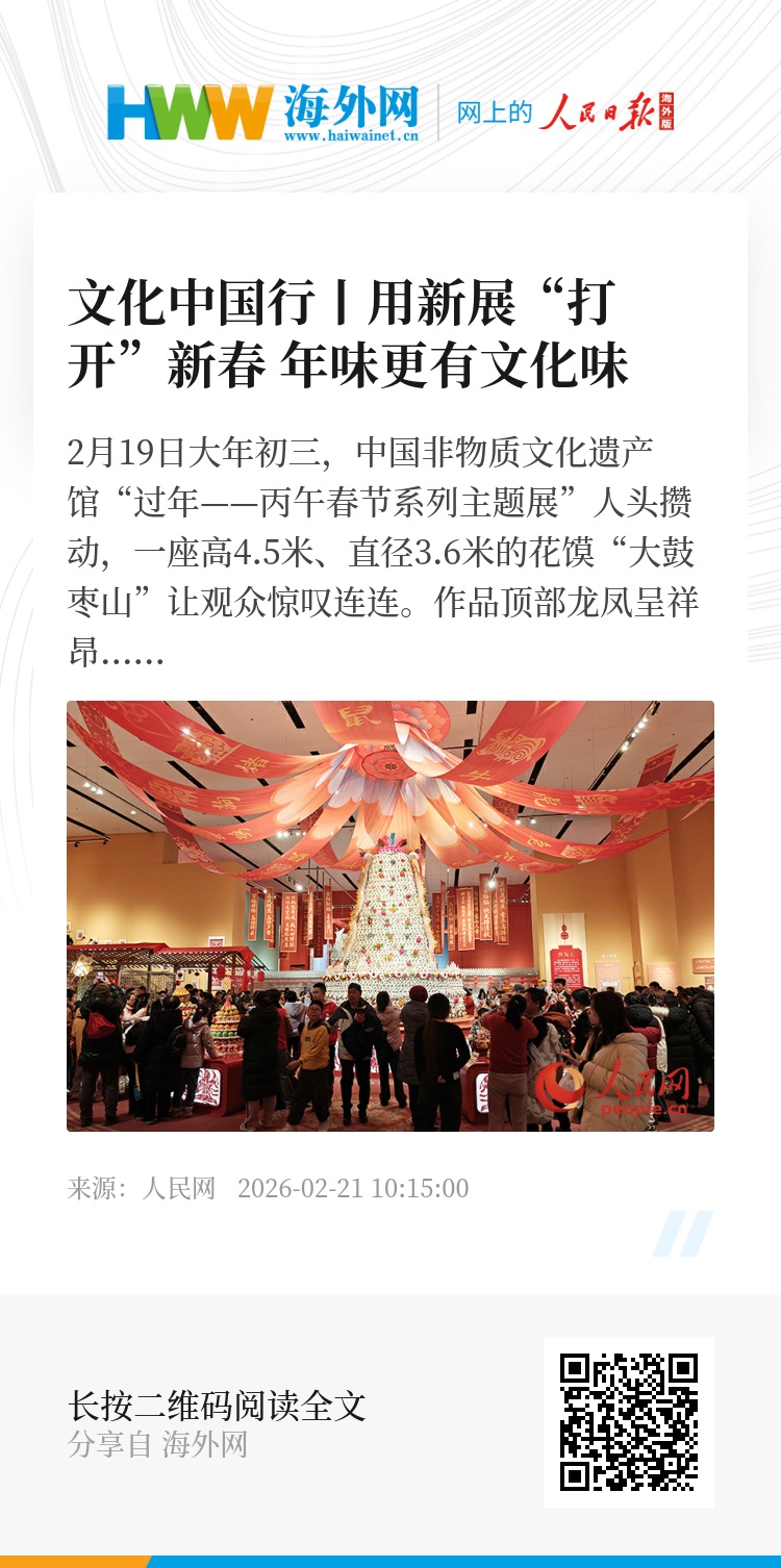2月19日大年初三,中国非物质文化遗产馆“过年——丙午春节系列主题展”人头攒动,一座高4.5米、直径3.6米的花馍“大鼓枣山”让观众惊叹连连。作品顶部龙凤呈祥昂首腾飞,周身点缀牡丹等数种花卉纹样,呈现出“五谷丰登,百花齐放”的繁荣景象。