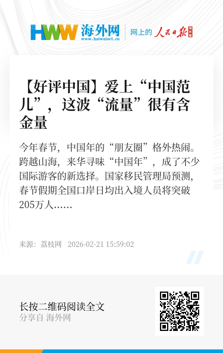 “到中国过年”成为一种国际时尚,外国游客的购物车装满“国潮”,我们看到的不仅是人流与物流的数字增长,更是一个古老民族在现代化进程中展现出的强大吸引力。这种吸引力,根植于五千年的文化沃土,勃发于高质量发展的创新实践,彰显于开放包容的大国气度。四海同春的中国年,正在向世界娓娓讲述一个可信、可爱、可敬的当代中国。(戴治国)
