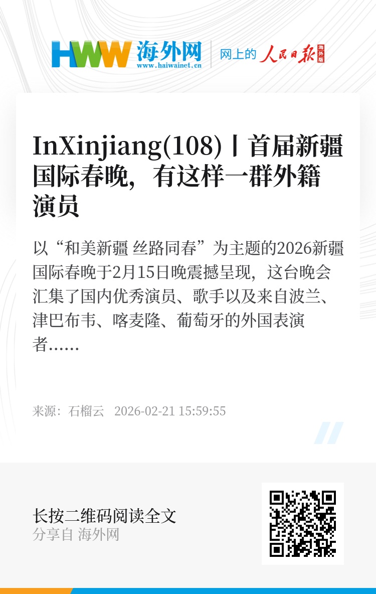 以“和美新疆 丝路同春”为主题的2026新疆国际春晚于2月15日晚震撼呈现,这台晚会汇集了国内优秀演员、歌手以及来自波兰、津巴布韦、喀麦隆、葡萄牙的外国表演者和留学生。InXinjiang在晚会彩排现场专访了几位外籍演员,他们之中,有人多次到访新疆,爱上这里的美食、人文与新疆美景;有人被艾德莱斯绸的传统与时尚打动;更有人真切感受到各民族和睦相处、开放包容的和谐氛围。
