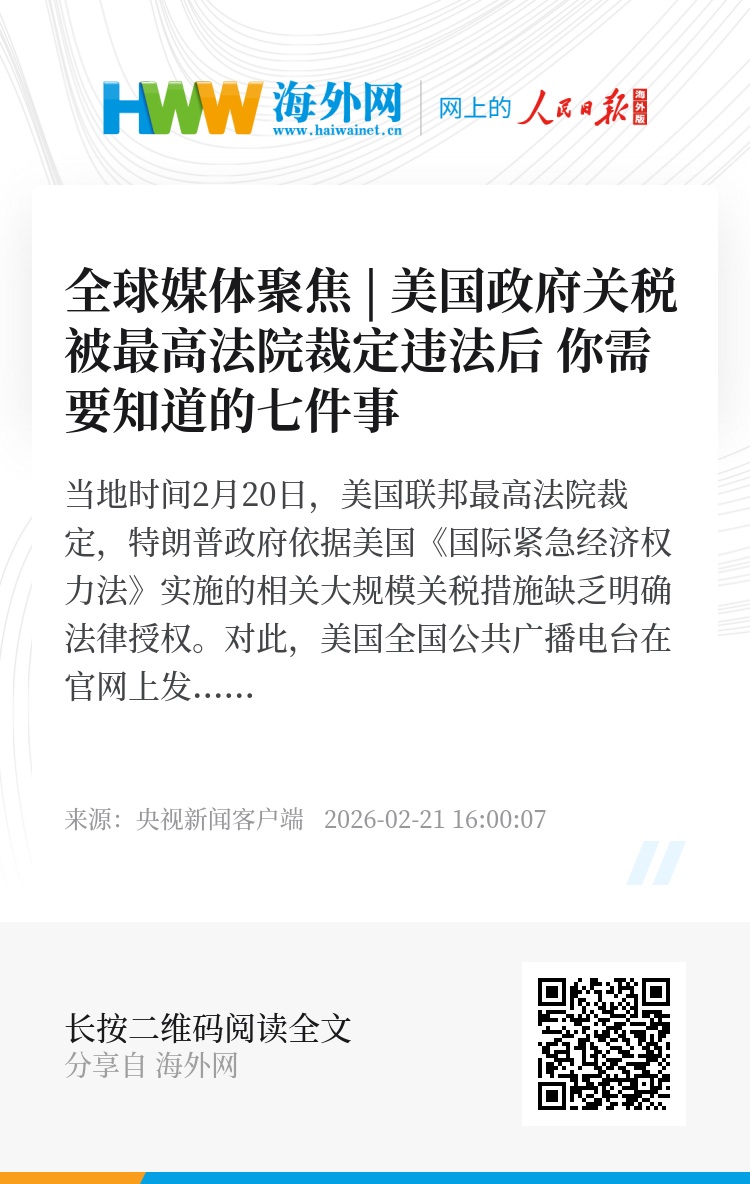 当地时间2月20日,美国联邦最高法院裁定,特朗普政府依据美国《国际紧急经济权力法》实施的相关大规模关税措施缺乏明确法律授权。对此,美国全国公共广播电台在官网上发文,梳理了这些关税措施被裁定违法意味着什么。
