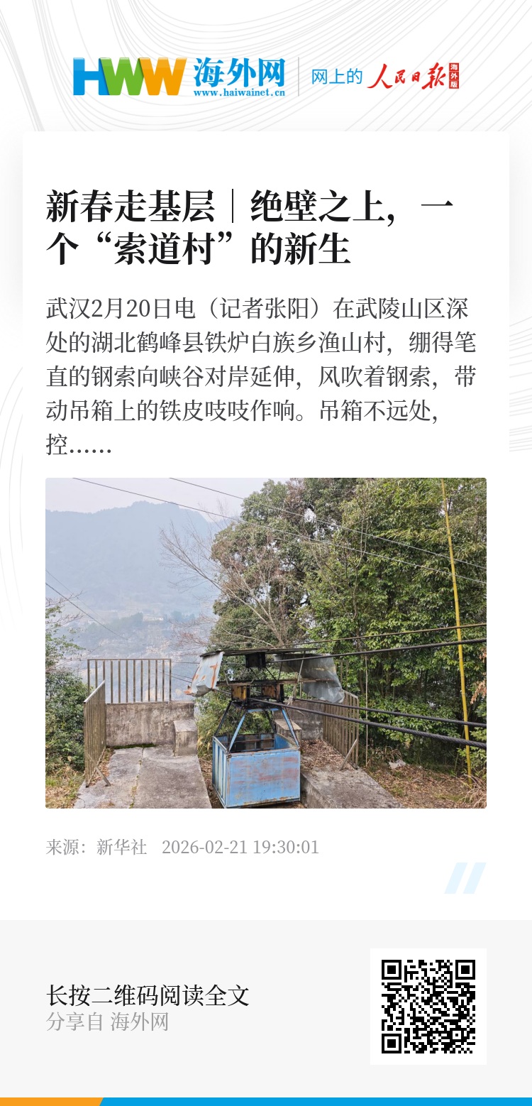 新华社武汉2月20日电(记者张阳)在武陵山区深处的湖北鹤峰县铁炉白族乡渔山村,绷得笔直的钢索向峡谷对岸延伸,风吹着钢索,带动吊箱上的铁皮吱吱作响。吊箱不远处,控制索道运行的机电房上了锁,门口杂草丛生。