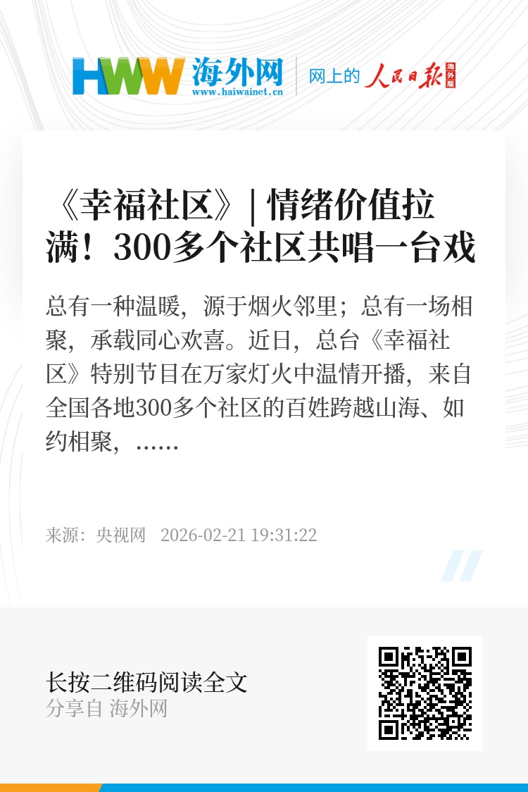 总有一种温暖,源于烟火邻里;总有一场相聚,承载同心欢喜。近日,总台《幸福社区》特别节目在万家灯火中温情开播,来自全国各地300多个社区的百姓跨越山海、如约相聚,将街头巷尾的家常、邻里之间的牵挂、基层生活的热望,都化作舞台上的欢声笑语与动人瞬间,打造了一场接地气、有温度、别开生面的新春文化盛宴。