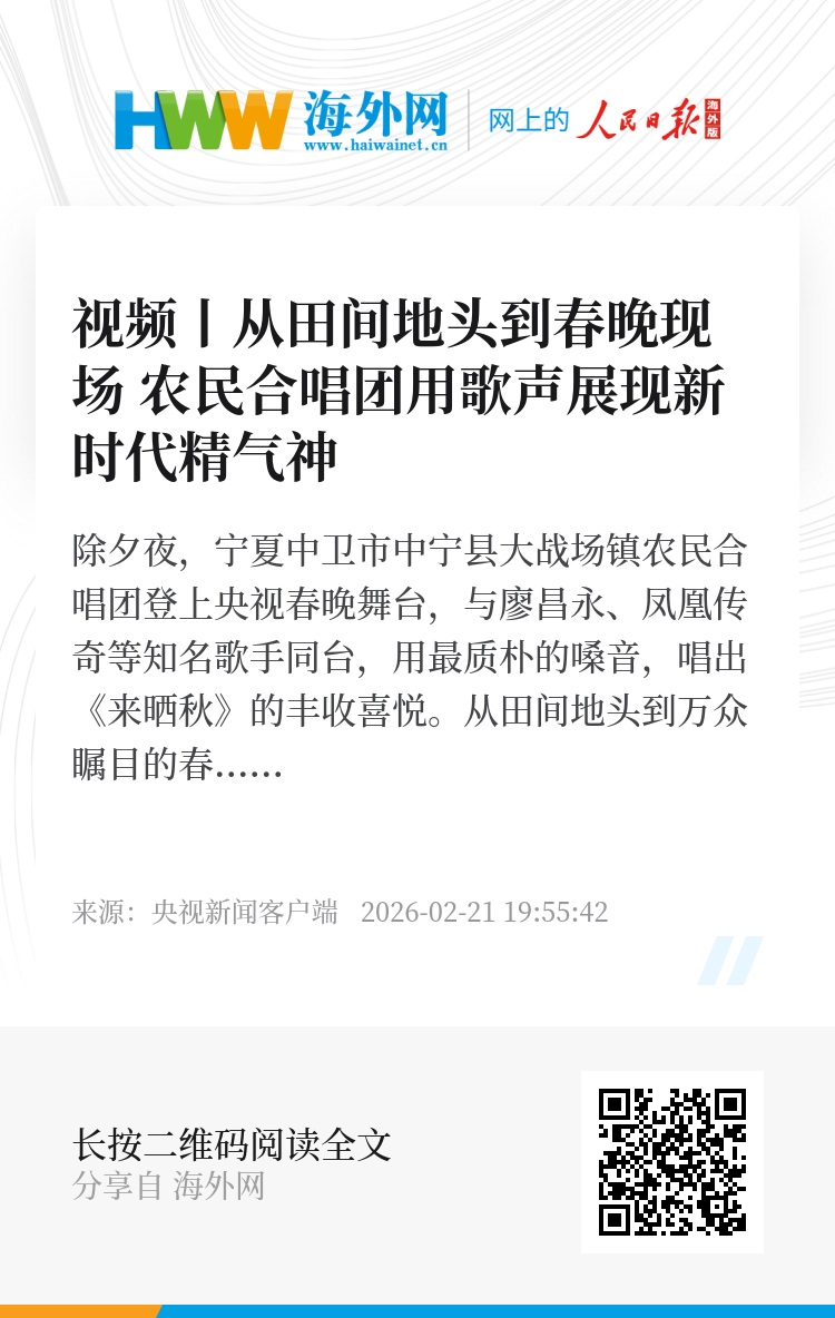 除夕夜,宁夏中卫市中宁县大战场镇农民合唱团登上央视春晚舞台,与廖昌永、凤凰传奇等知名歌手同台,用最质朴的嗓音,唱出《来晒秋》的丰收喜悦。