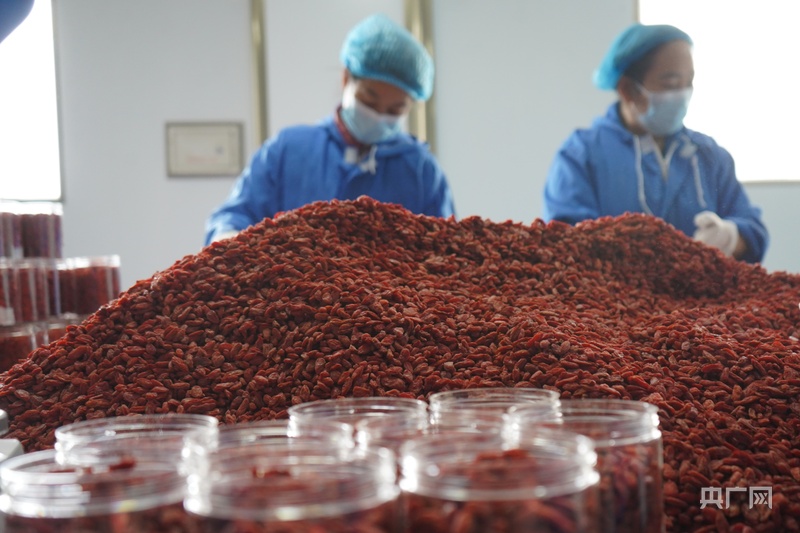 企业生产车间内,鲜红的枸杞正在打包装箱(央广网记者 汪晓青 摄)