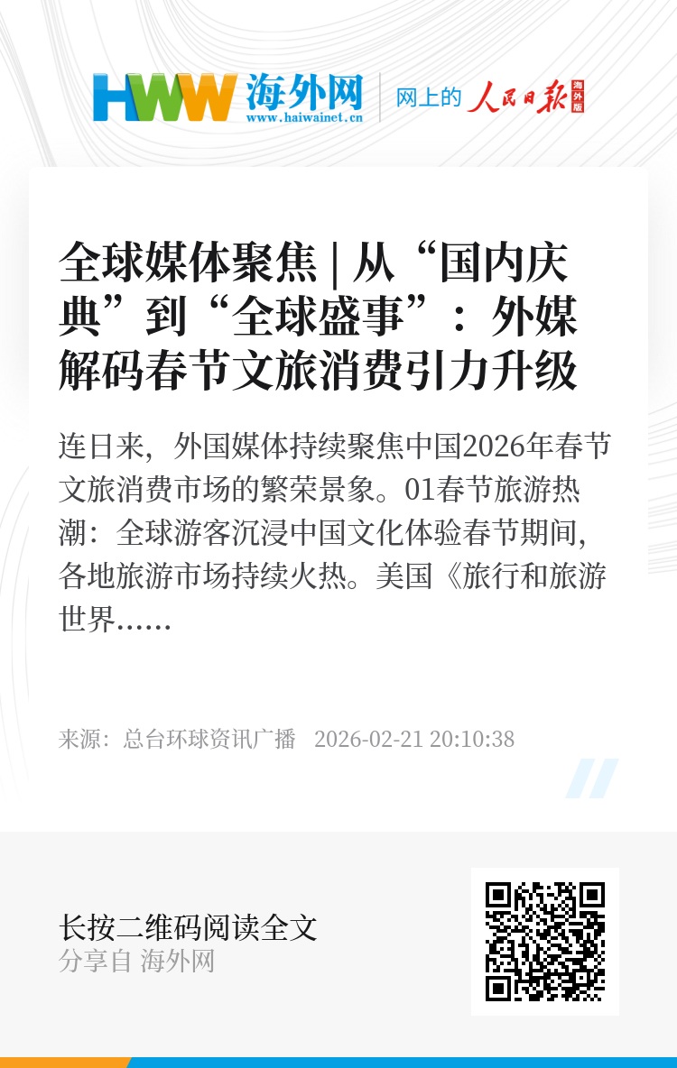连日来,外国媒体持续聚焦中国2026年春节文旅消费市场的繁荣景象。