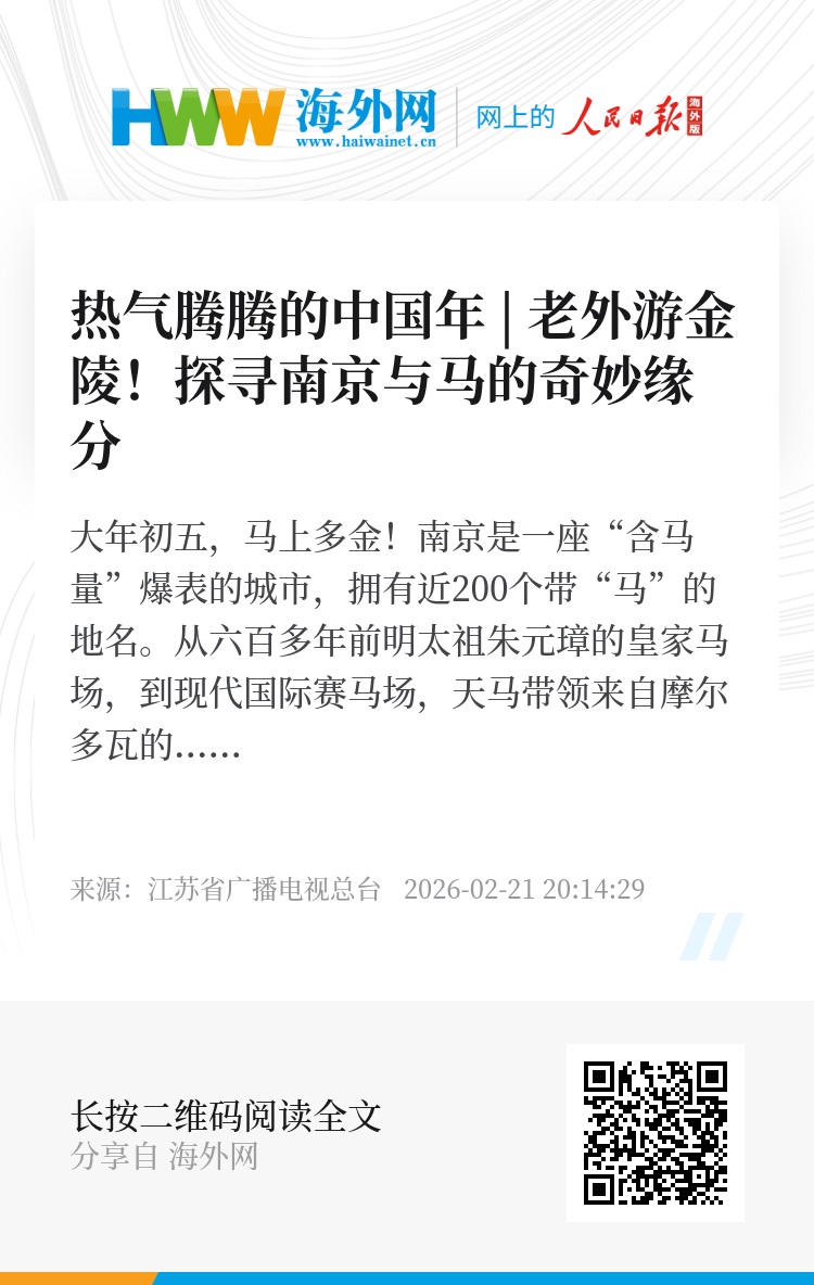 大年初五,马上多金!南京是一座“含马量”爆表的城市,拥有近200个带“马”的地名。从六百多年前明太祖朱元璋的皇家马场,到现代国际赛马场,天马带领来自摩尔多瓦的小姐姐Daniela来到马群,一同探寻南京与马的奇妙缘分!