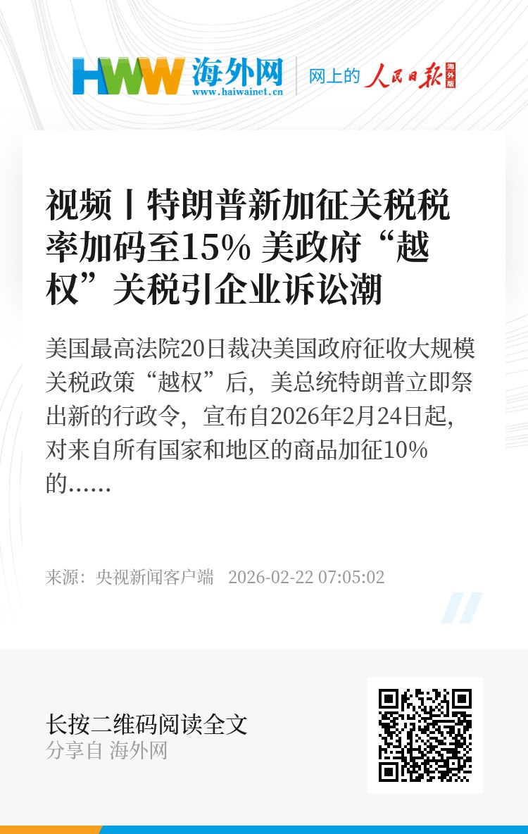 21日,特朗普又宣布,把这项新征收的“全球进口关税”税率由10%提升至15%。与此同时,美最高法裁决结果的影响也在同步显现。截至21日,已有数百家企业提起诉讼,要求退还此前因特朗普关税政策额外支付的关税款项。