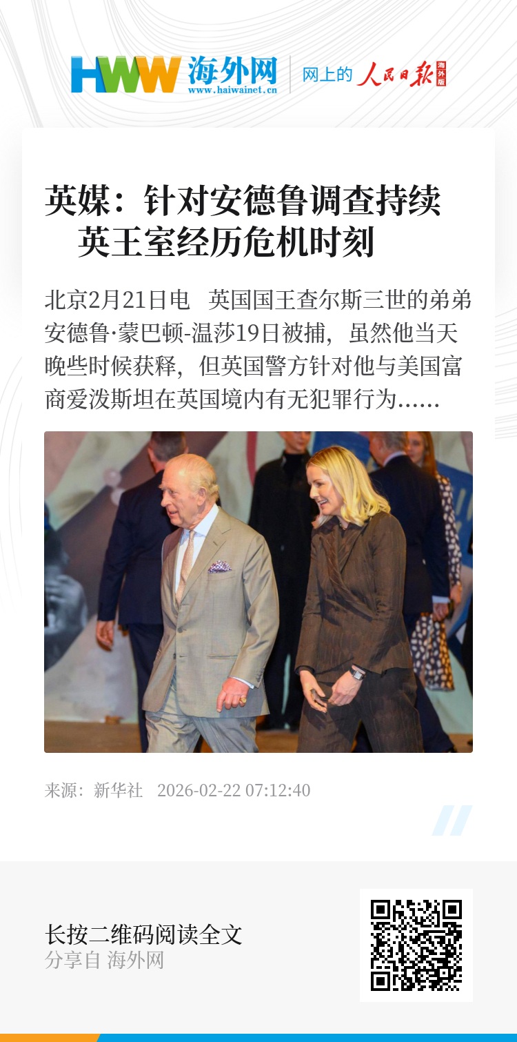 新华社北京2月21日电 英国国王查尔斯三世的弟弟安德鲁·蒙巴顿-温莎19日被捕,虽然他当天晚些时候获释,但英国警方针对他与美国富商爱泼斯坦在英国境内有无犯罪行为的多项调查仍在进行中。安德鲁获释后坐在汽车后座的照片成为英国各大媒体头条,配以“衰落”“垮台”等标题。英媒评论,这是17世纪40年代以来英国第一次有高级王室成员被捕,英国王室处在危机时刻。