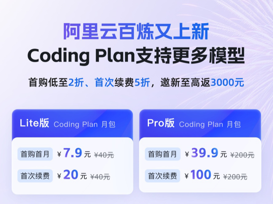 阿里云Coding Plan共有Lite基础版和Pro高级版两个套餐,其中,Lite基础套餐可享受每月最多18000次请求,新用户购买首月仅需7.9元;Pro高级套餐可享受每月90000次请求,可完成数千次复杂任务,新用户首月仅需39.9元,极大地降低高频次编码需求场景的成本。用户可在Qwen Code、Claude Code、Cline、OpenClaw等主流AI工具使用阿里云Coding Plan订阅服务。