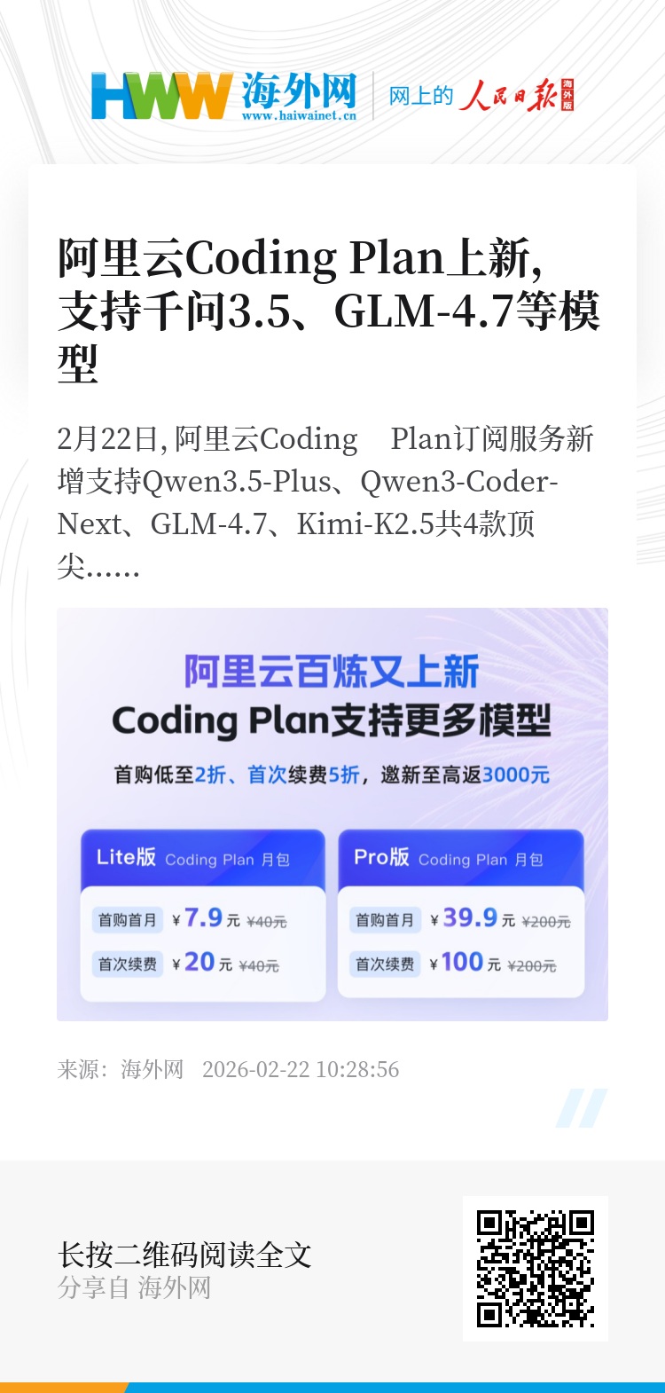 2月22日,阿里云Coding Plan订阅服务新增支持Qwen3.5-Plus、Qwen3-Coder-Next、GLM-4.7、Kimi-K2.5共4款顶尖编程模型,用户无需更改订阅和配置即可自由切换。阿里云Coding Plan还上线了优惠活动,即日起,新用户首购可享2折优惠,首月18000次请求额度仅需7.9元,90000次请求仅需39.9元。