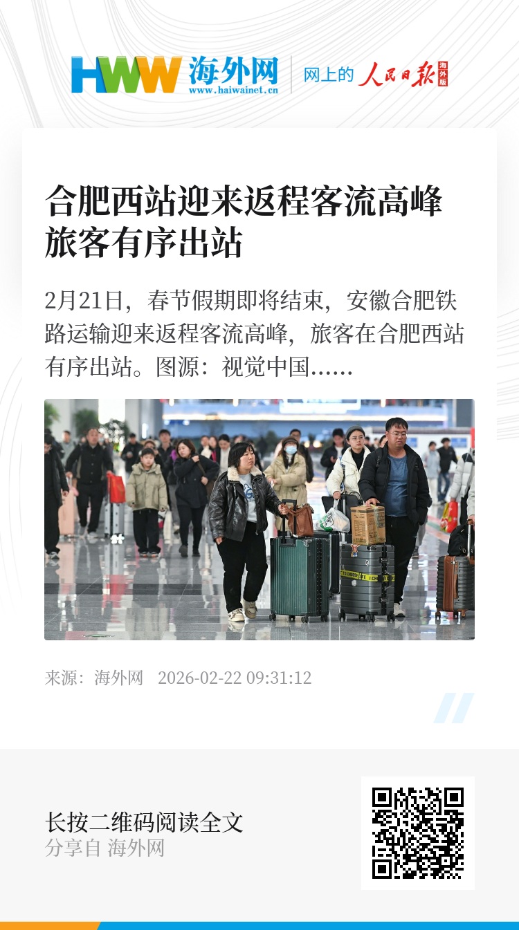 32932787,.合肥西站迎来返程客流高峰 旅客有序出站,.2026-02-22 09:31:12,.204428,.张青津、卢思宇