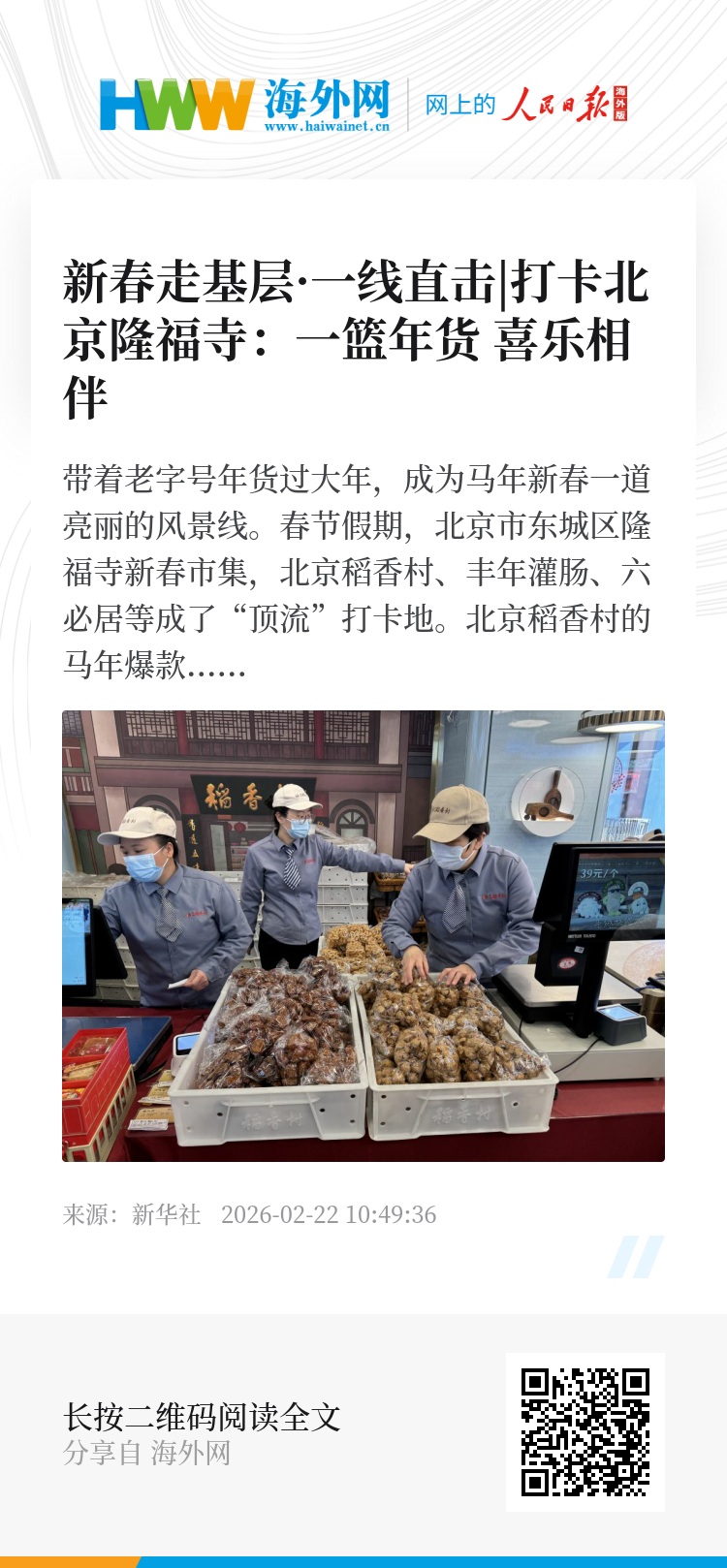 一篮年货,喜乐相伴。这热闹的市集景象,藏着中国人最朴素的年味与牵挂。老字号的“老味道”,是刻在几代人记忆里的儿时滋味,更是承载老北京民俗文脉的活态载体。正是这种浸润着烟火气与匠心的文化基因,让年轻一代也主动追寻、欣然打卡。