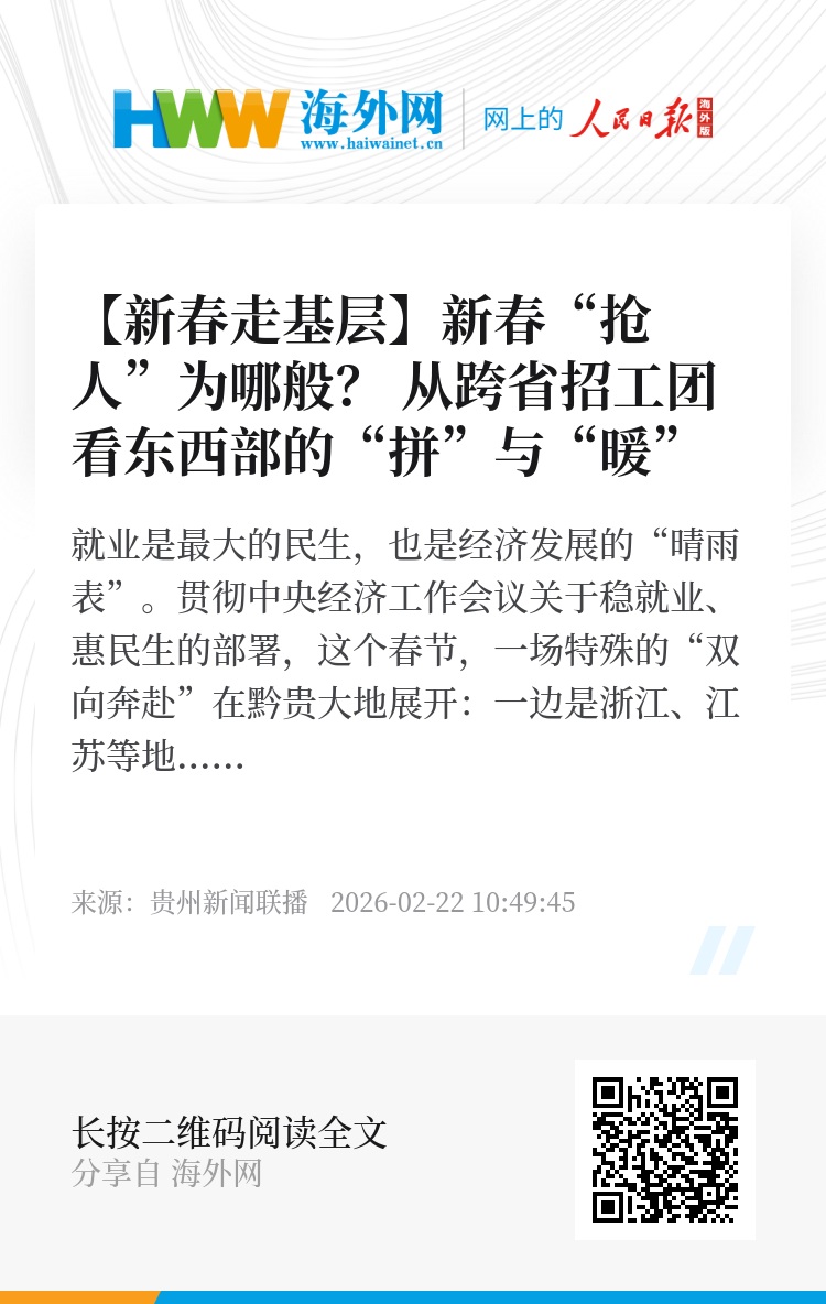 就业是最大的民生,也是经济发展的“晴雨表”。贯彻中央经济工作会议关于稳就业、惠民生的部署,这个春节,一场特殊的“双向奔赴”在黔贵大地展开:一边是浙江、江苏等地的招工团带着上万个岗位“赶早集”,一边是贵州作为劳务输出大省精准摸排、送技上门。当东部的发展机遇遇上西部的增收期盼,这场跨越千里的“新春抢人战”,不仅抢出了企业“开局即冲刺”的信心,更托举起万千家庭稳稳的幸福。来看记者从一线发回的报道。