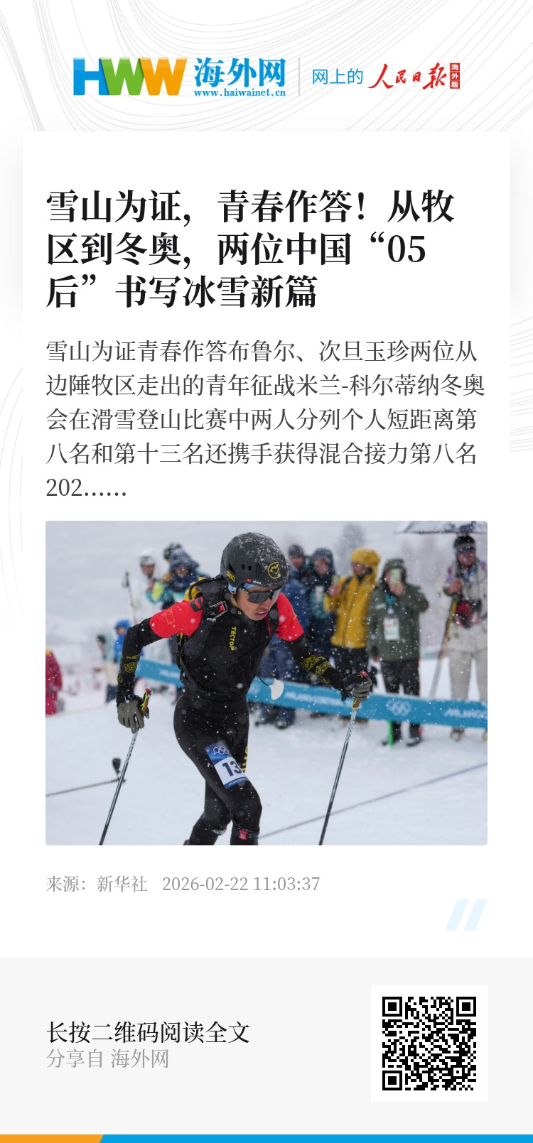 获得米兰-科尔蒂纳冬奥会滑雪登山混合接力比赛第八名的中国组合次旦玉珍(左)/布鲁尔在终点处合影(2026年2月21日摄)。新华社记者 胡虎虎 摄