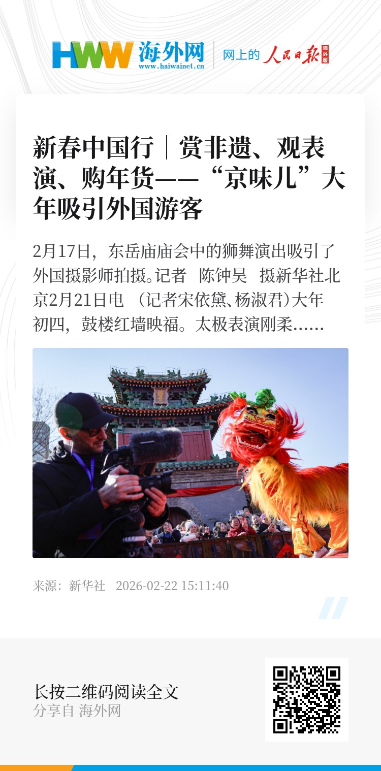 北京文旅以“非遗+旅游”为主线,吸引越来越多外国游客走进这座千年古都,沉浸式感受“中国年”。记者了解到,马年春节期间,北京市文化和旅游局为入境游客推出“入境必到5大榜单”和10条入境游精品线路,其中包括非遗体验、庙会、灯会、冰雪等多种新春体验内容。