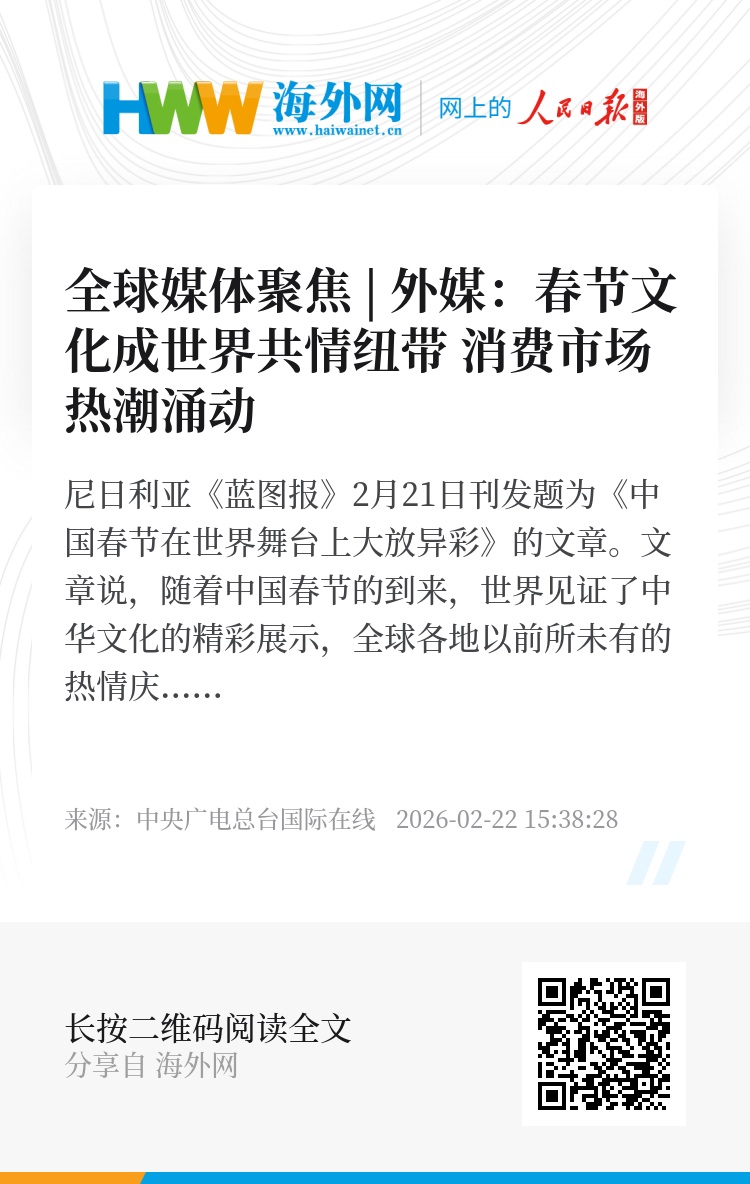 文章说,随着中国春节的到来,世界见证了中华文化的精彩展示,全球各地以前所未有的热情庆祝春节。2026年的春节庆祝活动已超越传统的家庭团聚和艺术表达,成为一场全球盛事,独特的“中国红”点亮了世界各地的地标建筑。