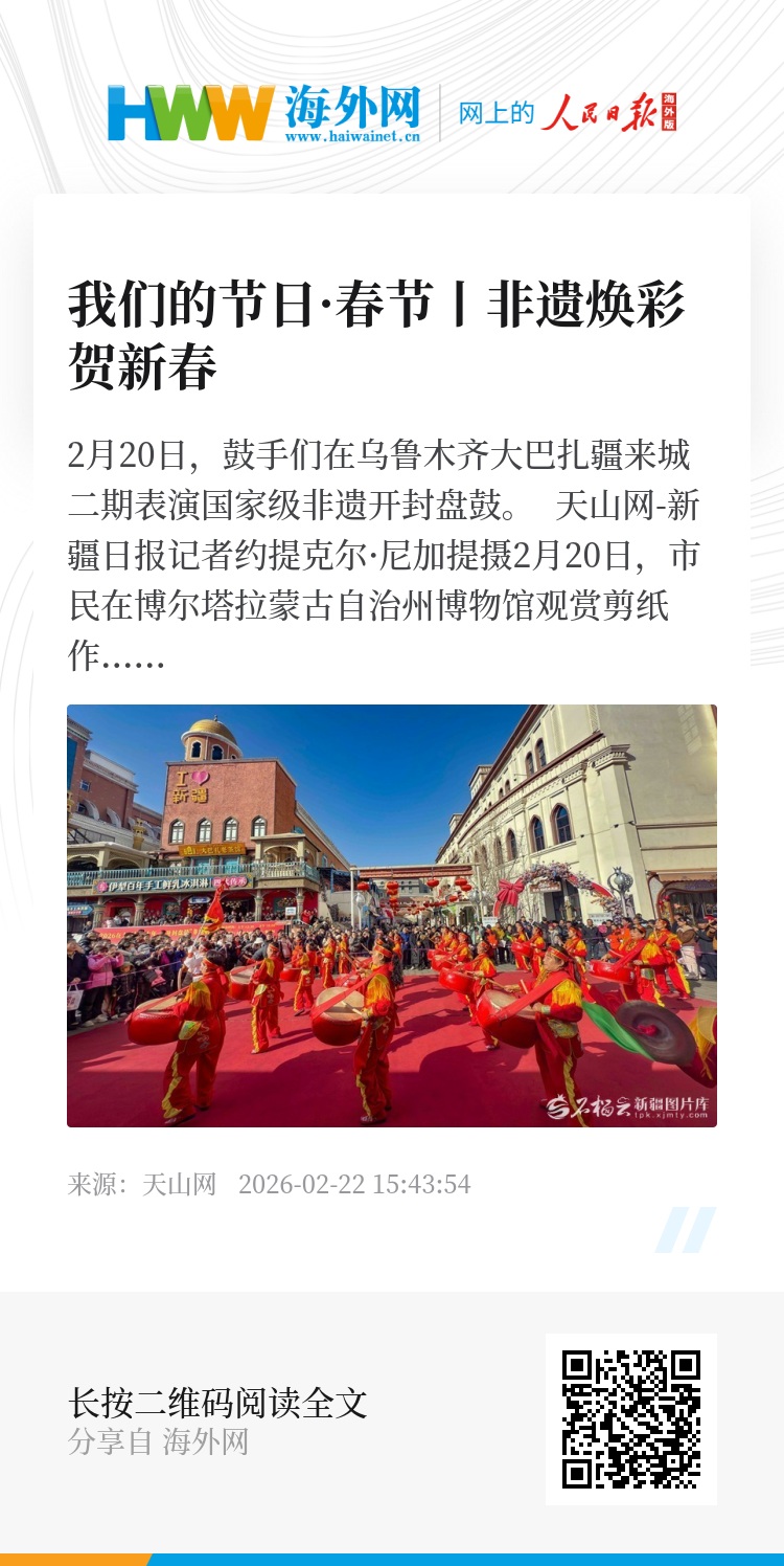 剪纸里的万马奔腾跃出红纸,皮雕上的骏马神韵在刀锋下苏醒,社火巡游的鼓点唤醒沉睡的年俗记忆……今年春节,全疆各地以“非遗贺新春·寻味中国年”为主题,开展古城过大年、马年灯会灯彩展示、马年非遗大集、非遗馆里过大年、春节民俗展演等系列活动,绘就出一幅幅传统与现代交织、传承与创新共舞的团圆图卷。
