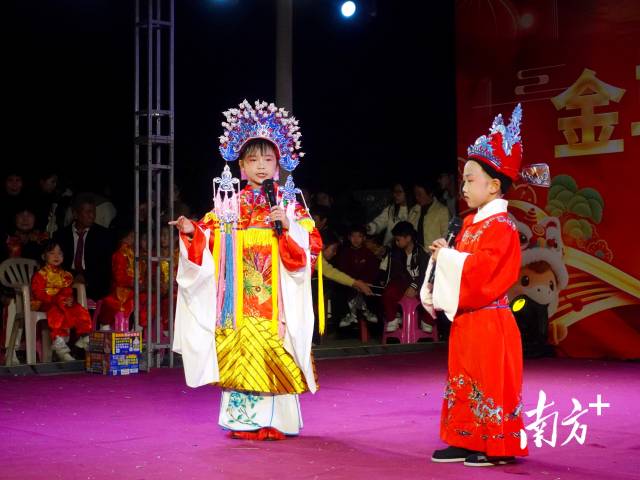 身着戏服的孩子们登台,咿咿呀呀地唱着潮剧。