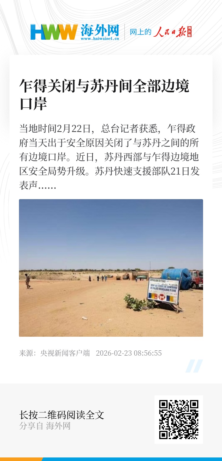 当地时间2月22日,总台记者获悉,乍得政府当天出于安全原因关闭了与苏丹之间的所有边境口岸。