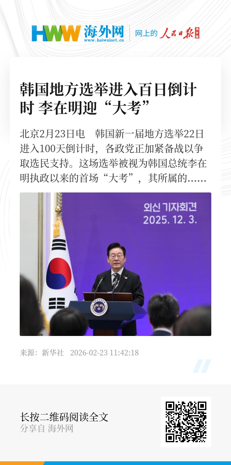 新华社北京2月23日电 韩国新一届地方选举22日进入100天倒计时,各政党正加紧备战以争取选民支持。这场选举被视为韩国总统李在明执政以来的首场“大考”,其所属的执政党共同民主党能否在选举中获胜成为外界关注焦点。