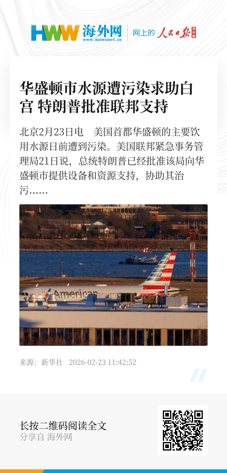 新华社北京2月23日电 美国首都华盛顿的主要饮用水源日前遭到污染。美国联邦紧急事务管理局21日说,总统特朗普已经批准该局向华盛顿市提供设备和资源支持,协助其治污。