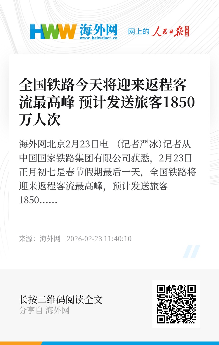 海外网北京2月23日电 (记者严冰)记者从中国国家铁路集团有限公司获悉,2月23日正月初七是春节假期最后一天,全国铁路将迎来返程客流最高峰,预计发送旅客1850万人次,计划加开旅客列车2297列。2月22日,全国铁路发送旅客1827.7万人次,连续3天保持在1500万人次以上,运输安全平稳有序。