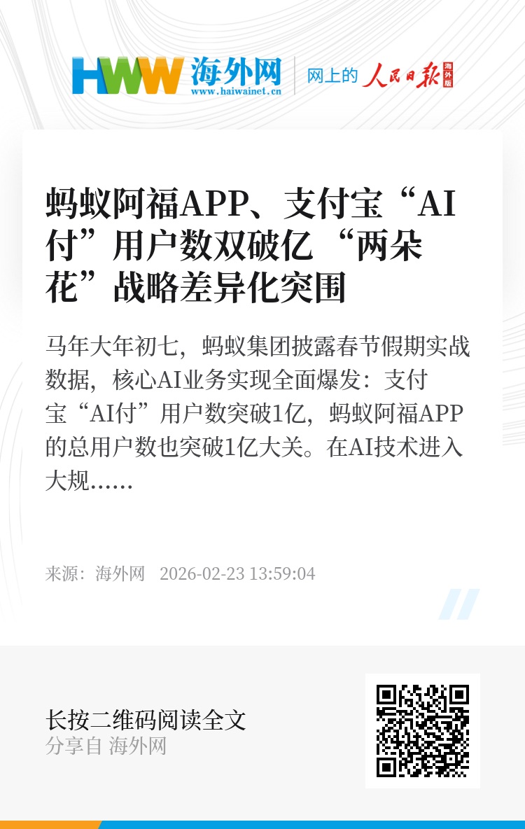 在AI原生支付上,随着AI技术深入日常消费场景,支付宝“AI付”在春节期间迎来爆发。数据显示,继2月12日支付笔数突破1.2亿笔后,用户数也正式超过1亿。至此,支付宝“AI付”成为全球首个支付笔数与用户人数双双破亿的AI原生支付产品,标志着该产品正式进入大规模商用阶段。