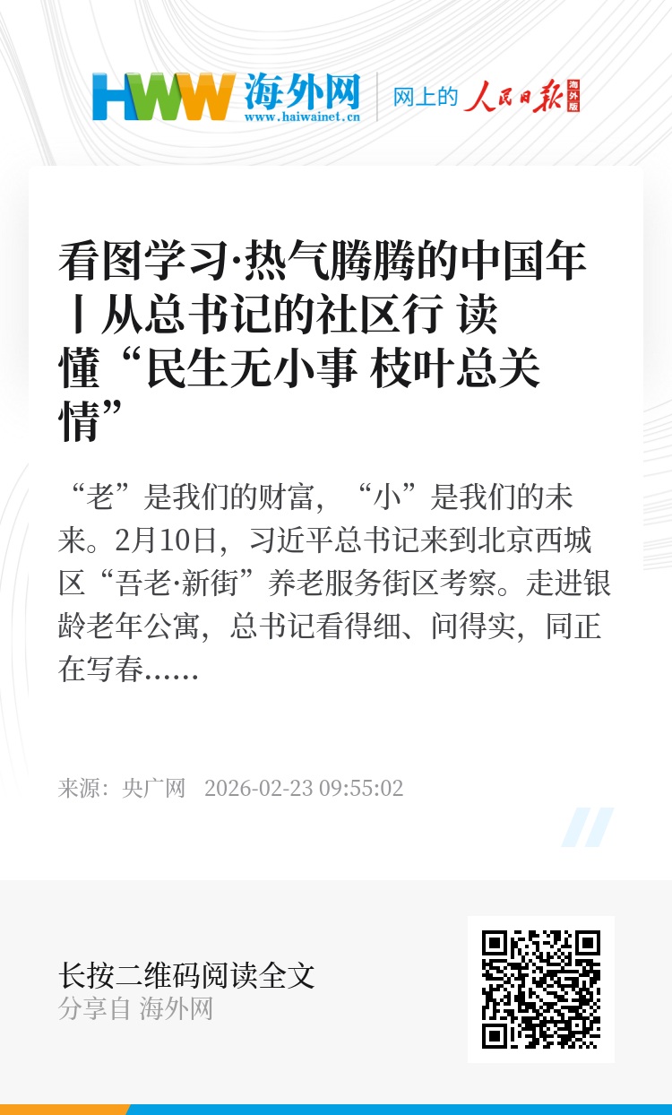 2月10日,习近平总书记来到北京西城区“吾老·新街”养老服务街区考察。走进银龄老年公寓,总书记看得细、问得实,同正在写春联、福字的老人们亲切交流。在同一街区的父母食堂,总书记还详细了解食堂对新就业群体和周边市民提供便民惠民服务的情况,叮嘱“一定要可持续”。