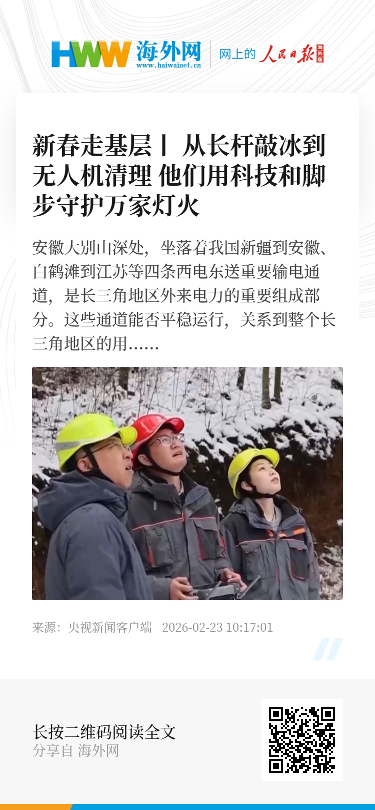 安徽大别山深处,坐落着我国新疆到安徽、白鹤滩到江苏等四条西电东送重要输电通道,是长三角地区外来电力的重要组成部分。这些通道能否平稳运行,关系到整个长三角地区的用电安全。新春走基层,跟随一支电力巡检队,走进大别山深处的特高压铁塔下,看他们是如何用科技和脚步守护万家灯火的。