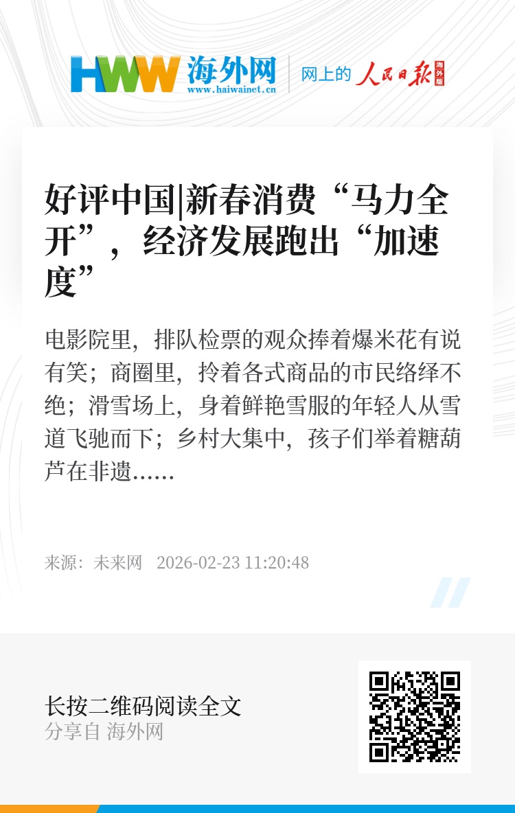 新春消费热潮涌动,蕴藏着千家万户对美好生活的向往,也彰显着“不断巩固拓展经济稳中向好势头”的强劲脉动。在丙午马年,春节假期激荡的消费热情、汇聚的发展信心,正激励我们在新征程上策马扬鞭、乘势而上,推动中国经济在夯基蓄势中砥砺奋进!(未来网评论员 魏平)