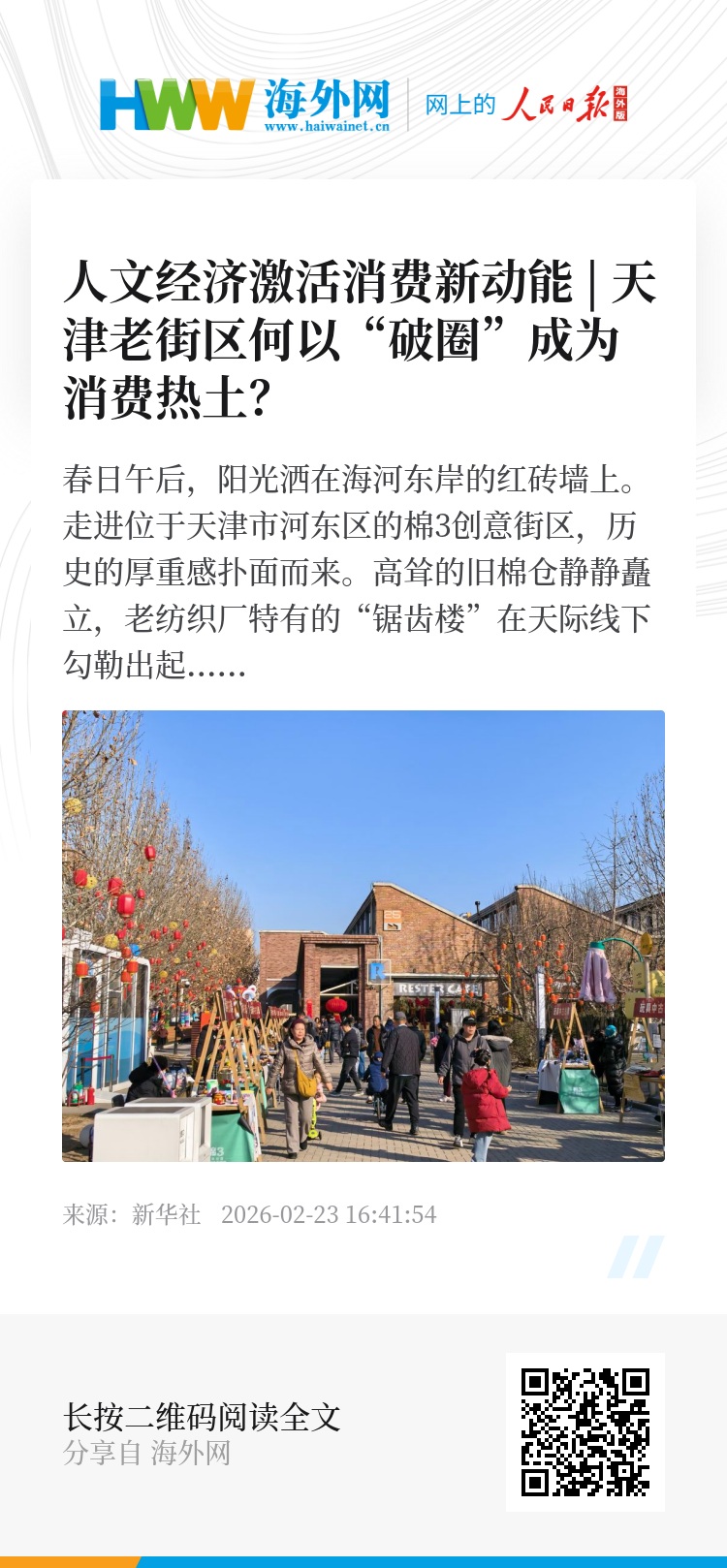当百年街巷重现光彩,升腾的不只是节日里的烟火人气,更积蓄着一座城市更新迭代的活力。在历史风貌与消费场景的交融中,老街区不断拓展功能边界、延展生活半径,为城市高质量发展注入持久而鲜活的动力。(记者马博文、宋瑞)