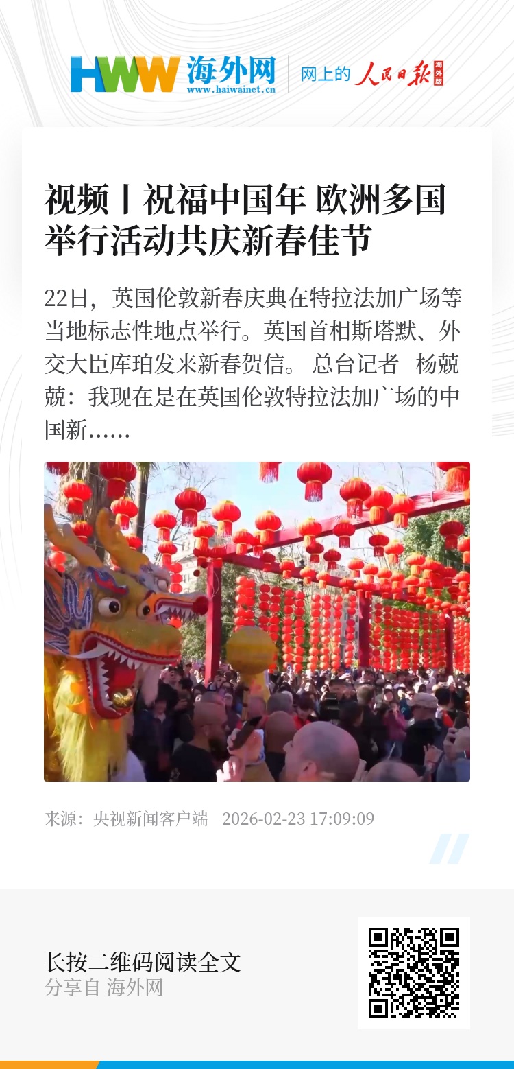 22日,英国伦敦新春庆典在特拉法加广场等当地标志性地点举行。英国首相斯塔默、外交大臣库珀发来新春贺信。