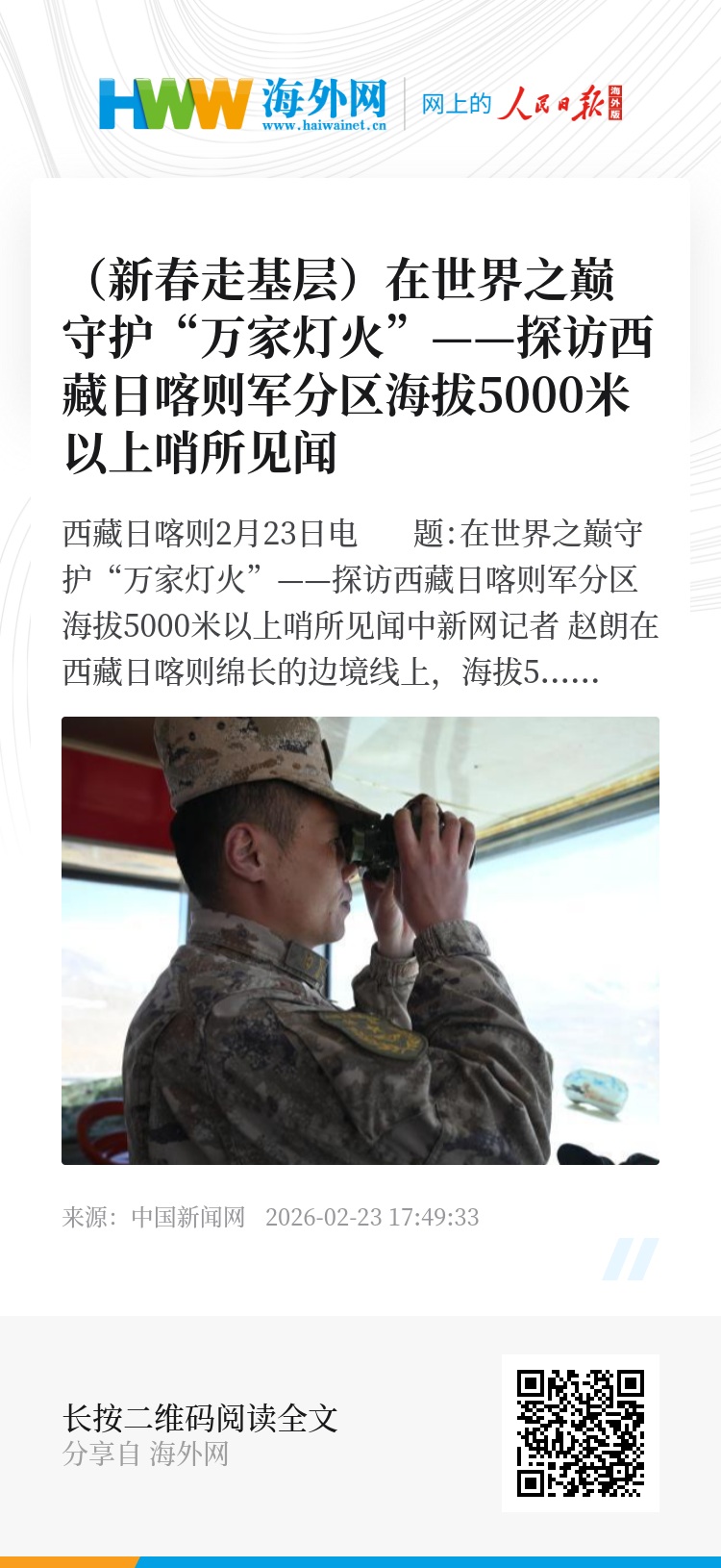 中新网西藏日喀则2月23日电 题:在世界之巅守护“万家灯火”——探访西藏日喀则军分区海拔5000米以上哨所见闻
