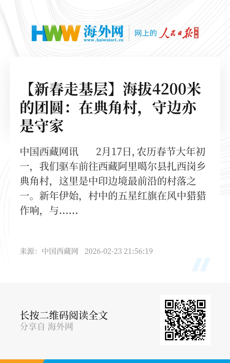 中国西藏网讯 2月17日,农历春节大年初一,我们驱车前往西藏阿里噶尔县扎西岗乡典角村,这里是中印边境最前沿的村落之一。新年伊始,村中的五星红旗在风中猎猎作响,与家家户户门前新换的白色香布交相辉映。在这片平均海拔4200米以上的雪域边陲,“年味”不仅是团圆,更是一种刻在骨子里的坚守。