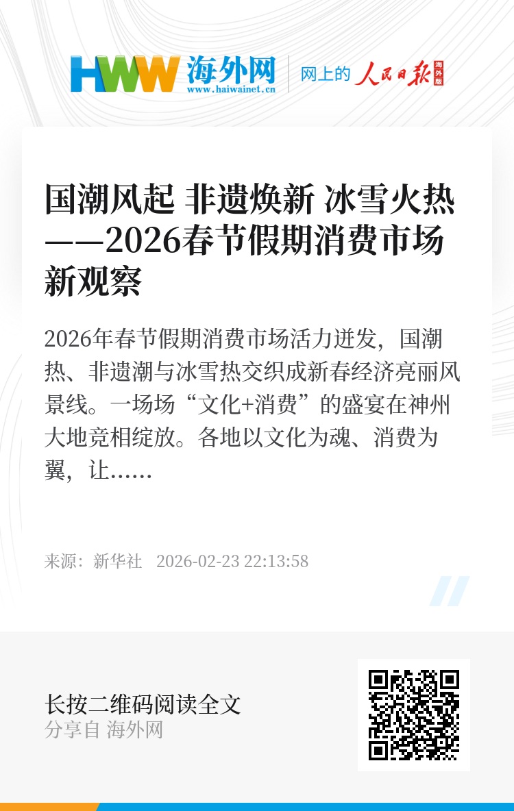 2026年春节假期消费市场活力迸发,国潮热、非遗潮与冰雪热交织成新春经济亮丽风景线。