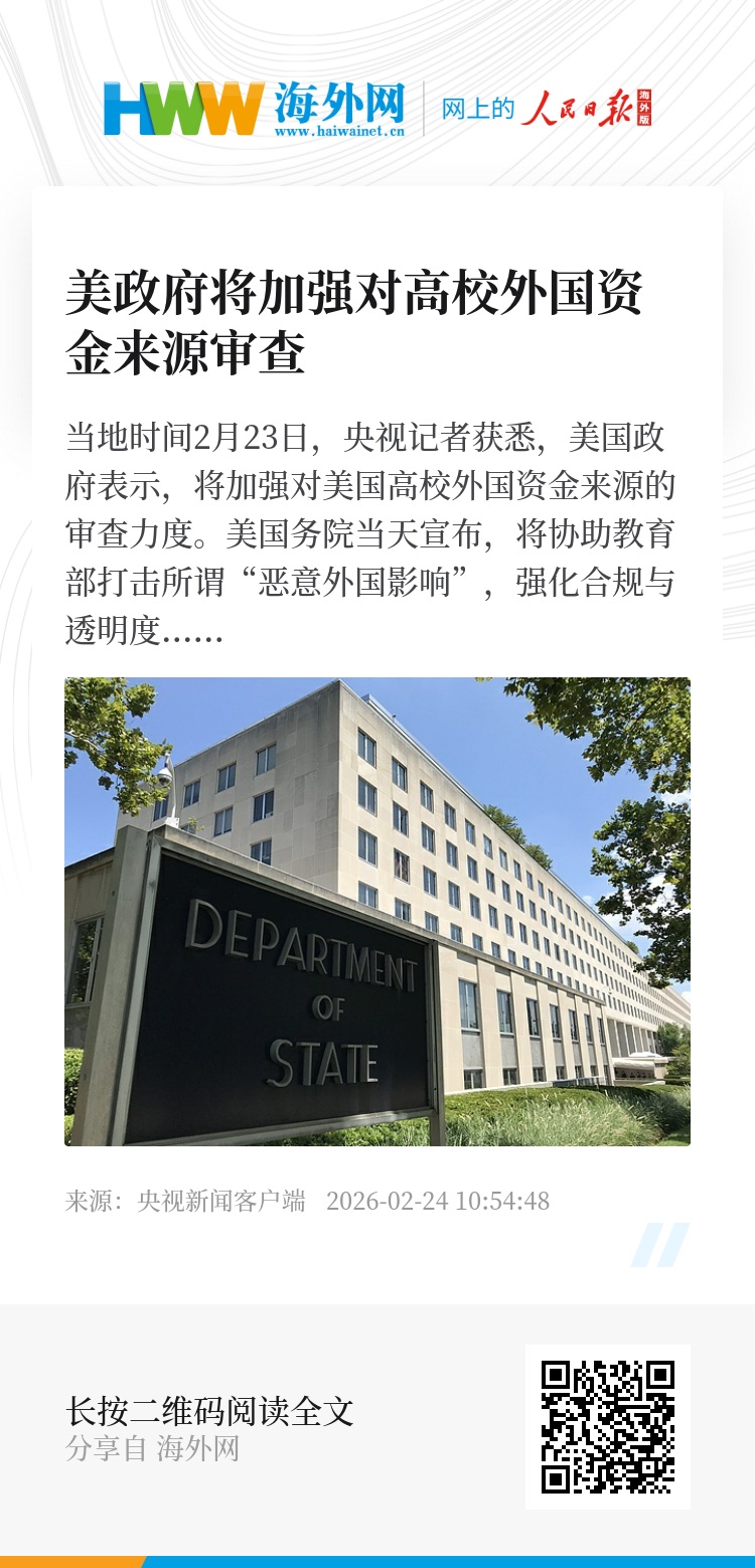 当地时间2月23日,央视记者获悉,美国政府表示,将加强对美国高校外国资金来源的审查力度。美国务院当天宣布,将协助教育部打击所谓“恶意外国影响”,强化合规与透明度监管。