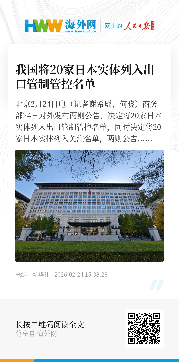 新华社北京2月24日电(记者谢希瑶、何晓)商务部24日对外发布两则公告,决定将20家日本实体列入出口管制管控名单,同时决定将20家日本实体列入关注名单,两则公告均自公布之日起正式实施。