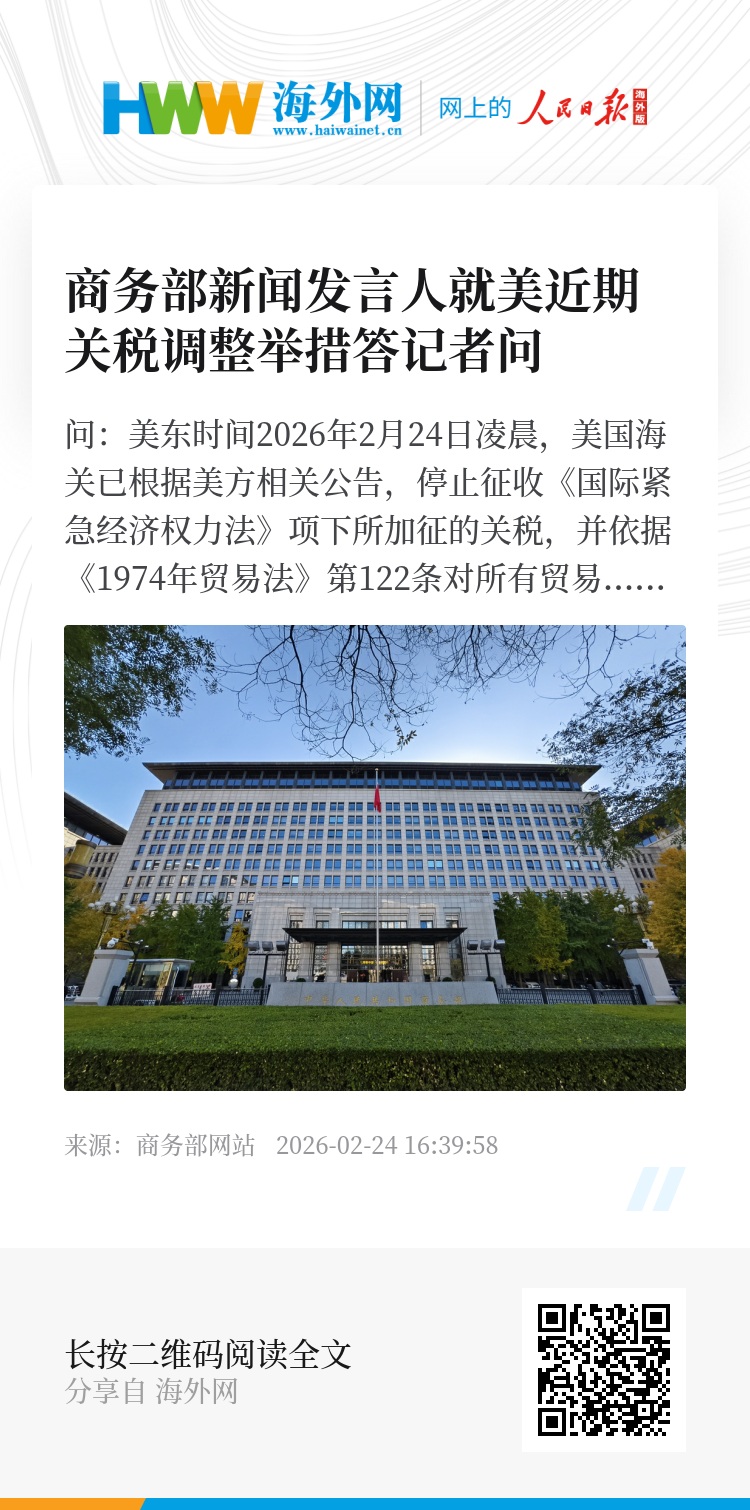 问:美东时间2026年2月24日凌晨,美国海关已根据美方相关公告,停止征收《国际紧急经济权力法》项下所加征的关税,并依据《1974年贸易法》第122条对所有贸易伙伴征收进口附加费。请问中方对上述有何评论?是否会采取相应措施?