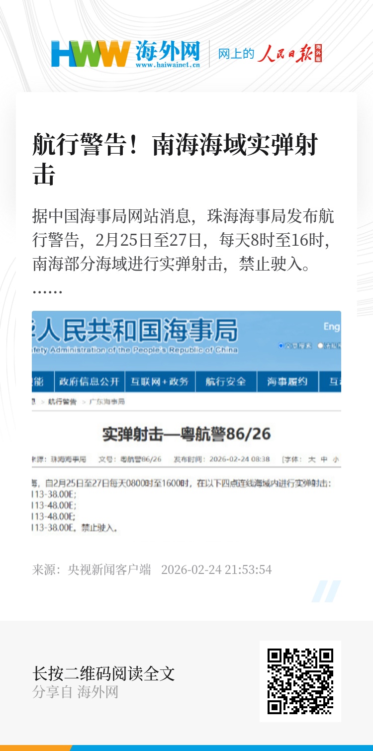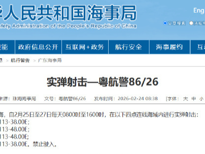 据中国海事局网站消息,珠海海事局发布航行警告,2月25日至27日,每天8时至16时,南海部分海域进行实弹射击,禁止驶入。