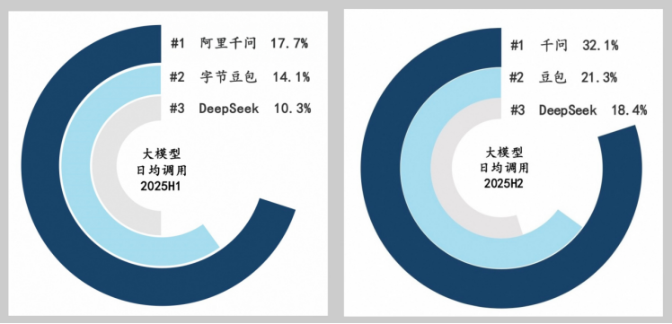 在此背景下,企业级大模型市场正加速向头部厂商集中。2025年下半年,大模型日均tokens消耗TOP3为:千问(32.1%)、豆包(21.3%)和DeepSeek(18.4%)。值得关注的是,2025年上半年,TOP3也是此三家,彼时,三者的占比总和还不到一半;而到下半年,三者占比总和已超过七成。其中阿里云千问的增速更是高达14.4%。