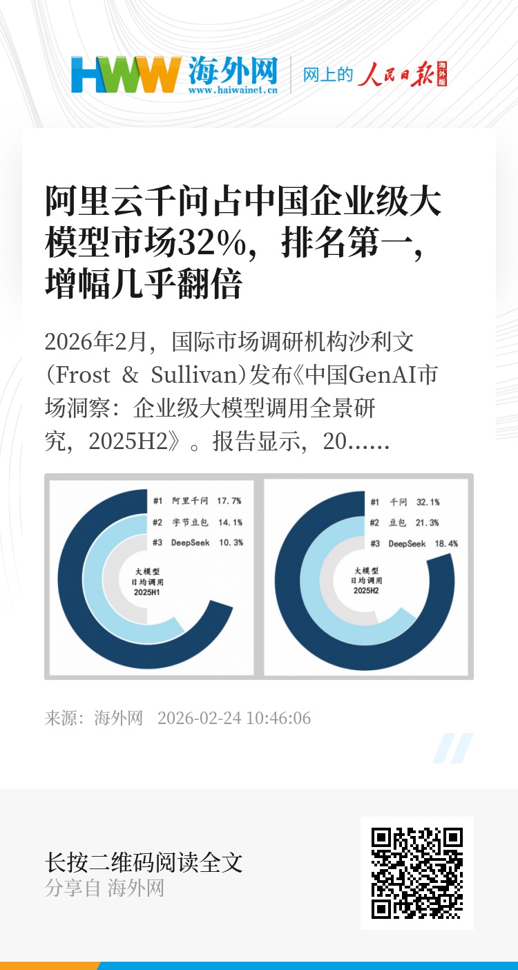2026年2月,国际市场调研机构沙利文(Frost & Sullivan)发布《中国GenAI市场洞察:企业级大模型调用全景研究,2025H2》。报告显示,2025年下半年,中国企业级大模型日均调用量飙升至37.0万亿tokens,较上半年的10.2万亿增长263%。头部大模型占比均有提升,其中,阿里云千问(Qwen)增幅最多,占比跃升至32.1%,相较上半年的17.7%几乎翻倍,领先优势扩大,成为最受中国企业青睐的大模型。
