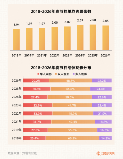 灯塔研究院报告显示,2026年春节档平均票价47.8元,创2021年以来新低,观众观影门槛进一步降低;总场次超435万,创春节档历史新高;双人观影占比48.5%、多人观影占比22.2%,双人和多人观影合计占比再破70%,社交需求仍是春节档观影的稳定基石。